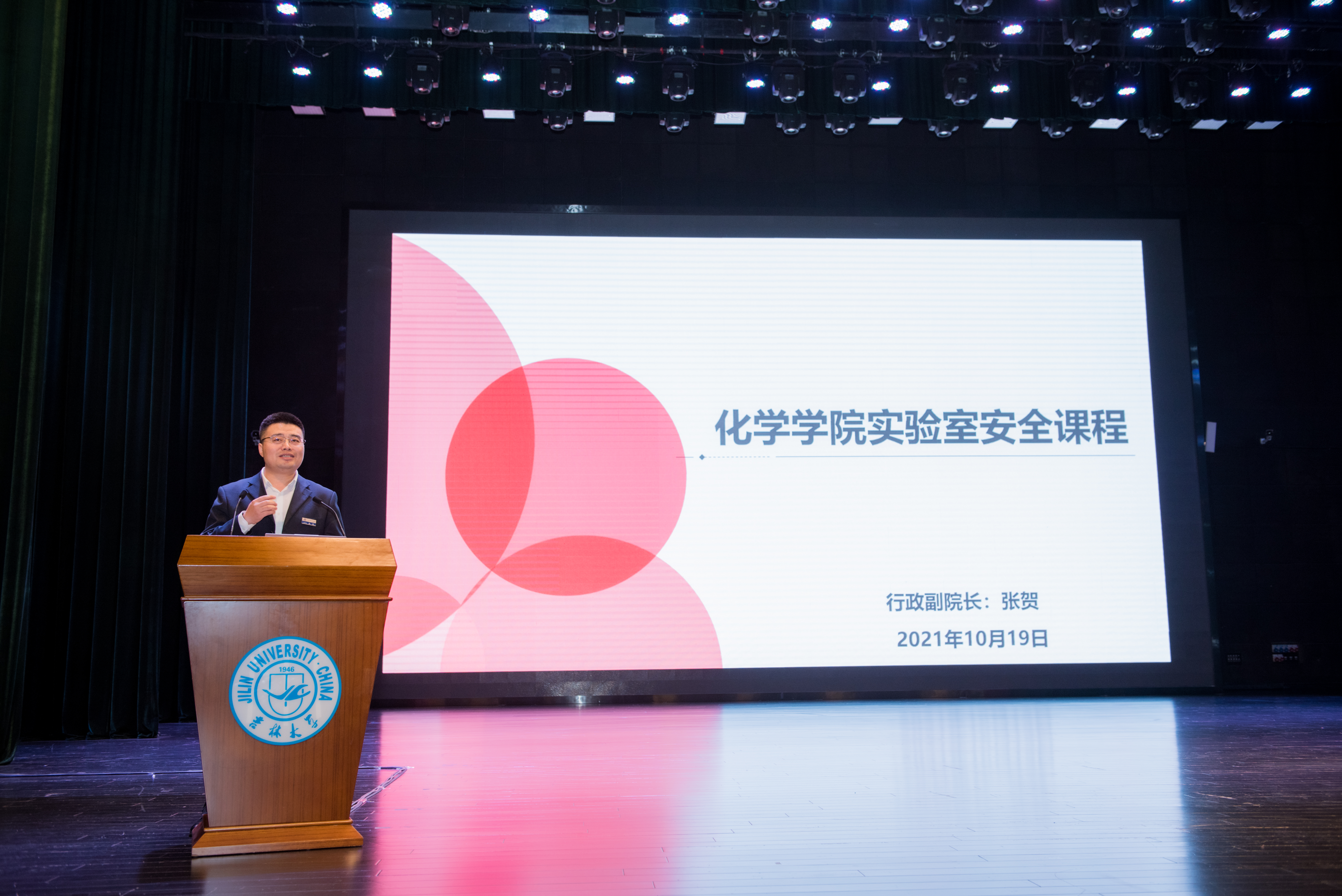 张贺代表学院的讲话中表示,感谢学校实验室管理处对于学院安全工作的支持和肯定,将在“安全月”系列活动中陆续举办实验及消防安全培训讲座、消防应急疏散演练和消防器材使用培训、化学实验安全与规范慕课、化学实验室安全知识短视频展播、袋鼠影视
