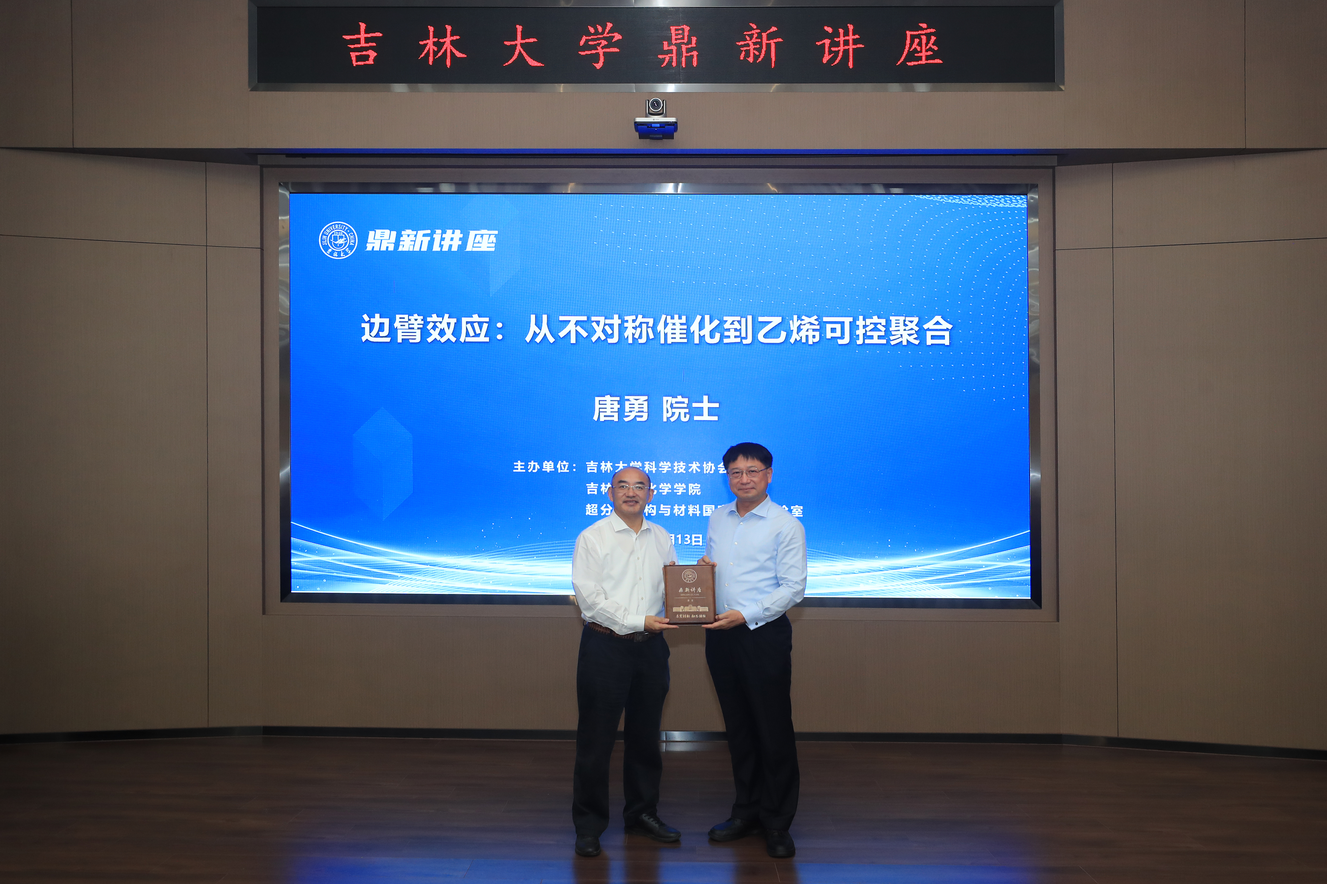 校长张希出席讲座并为唐勇院士颁发“鼎新讲座纪念牌”。超分子结构与材料国家重点实验室主任孙俊奇主持讲座。