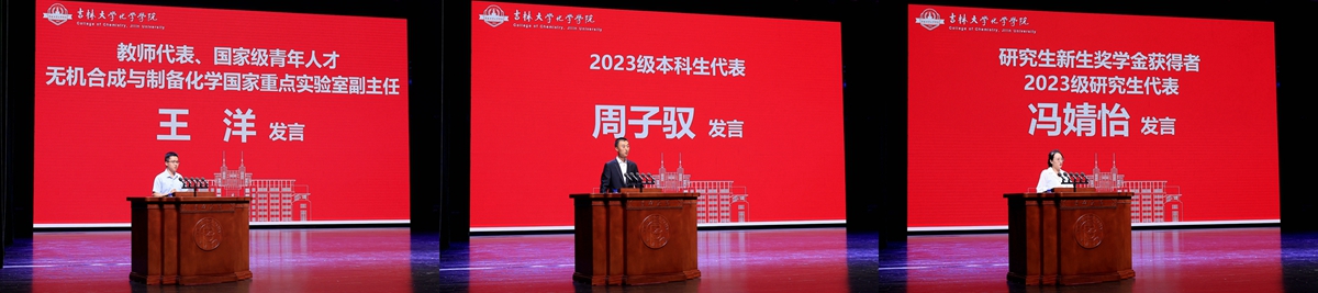 2023级本科生周子驭、2023级研究生冯婧怡代表全体新生发言时表示,将牢记“献身、创新、求实、协作”的院训精神,不负青春,不负韶华,努力成长为心怀家国的新时代化学人才。