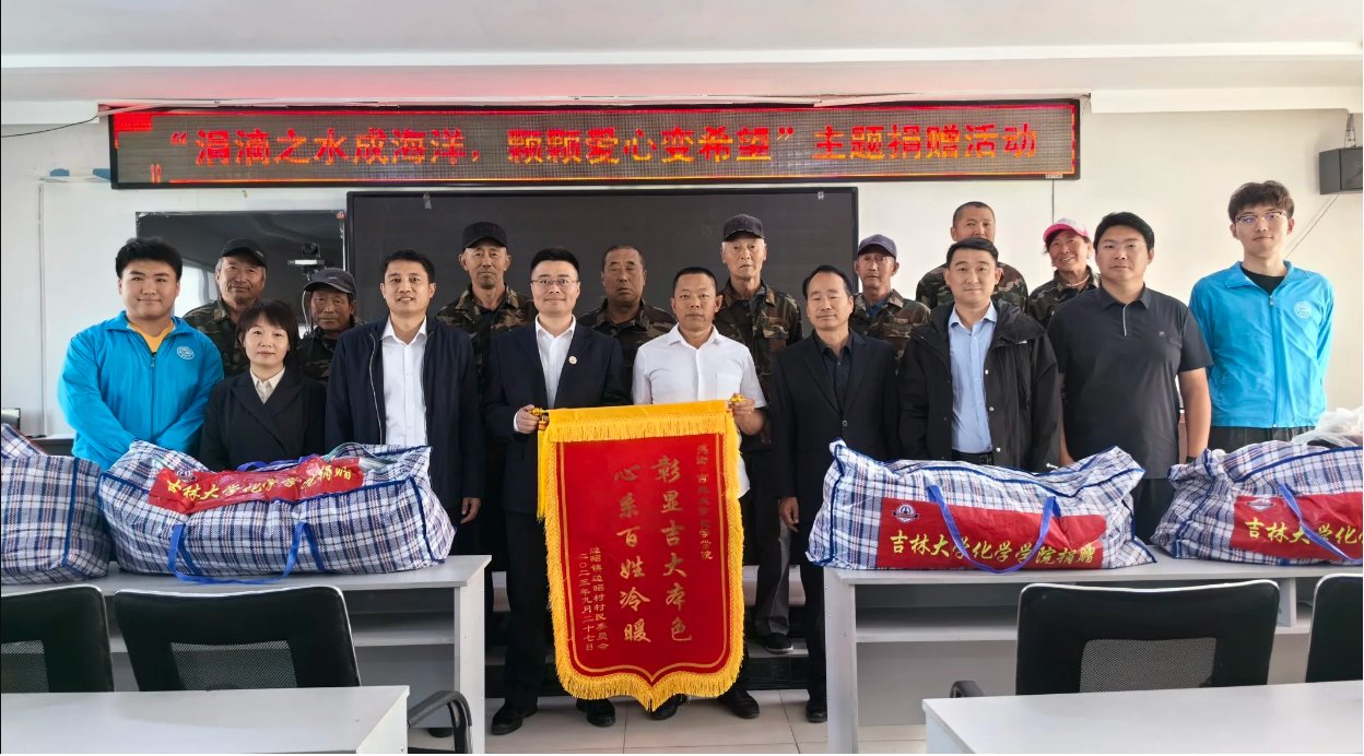 一行人前往边昭镇开展了“涓滴之水成海洋,颗颗爱心变希望”的主题捐赠活动,为当地老乡送去了羽绒马甲、军训衣物、洗护套装等生活物资。捐赠现场暖意融融,此次活动既帮助村民解决了生活中的实际困难,也进一步巩固和加强了吉大化学与边昭镇盐碱地相关项目的深入合作与交流,为边昭镇开展乡村振兴事业再添助力。