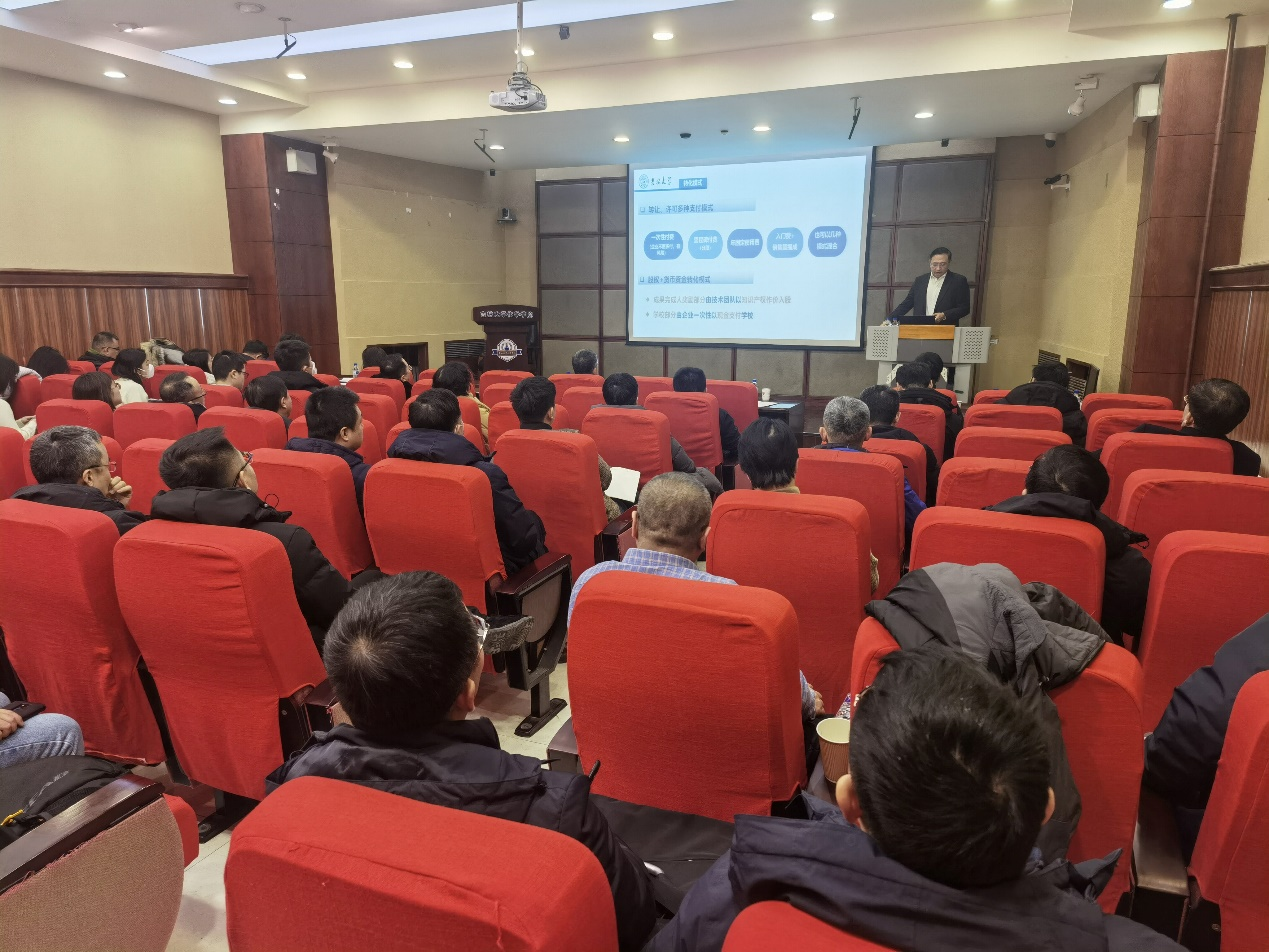 吕中元院长对科研院科技开发办公室一直以来对学院的鼎力支持与倾心帮助表示衷心感谢。他指出,科技创新为构建新发展格局、推动高质量发展提供了有力支撑,科学研究也不仅仅局限于自由探索,更是要服务于国家的“四个面向”。各级政府和学校为科研人员提供了多样化政策帮扶,通过“服务+管理”的新型模式提供各种便利。因此,当下正是“创业”的黄金时期。希望各位教师抓住机遇,将科研精力适当向成果转化倾斜,争取让“实验室科研成果”产生更大的经济与社会效益,实实在在地服务于国家需求和地方经济发展。