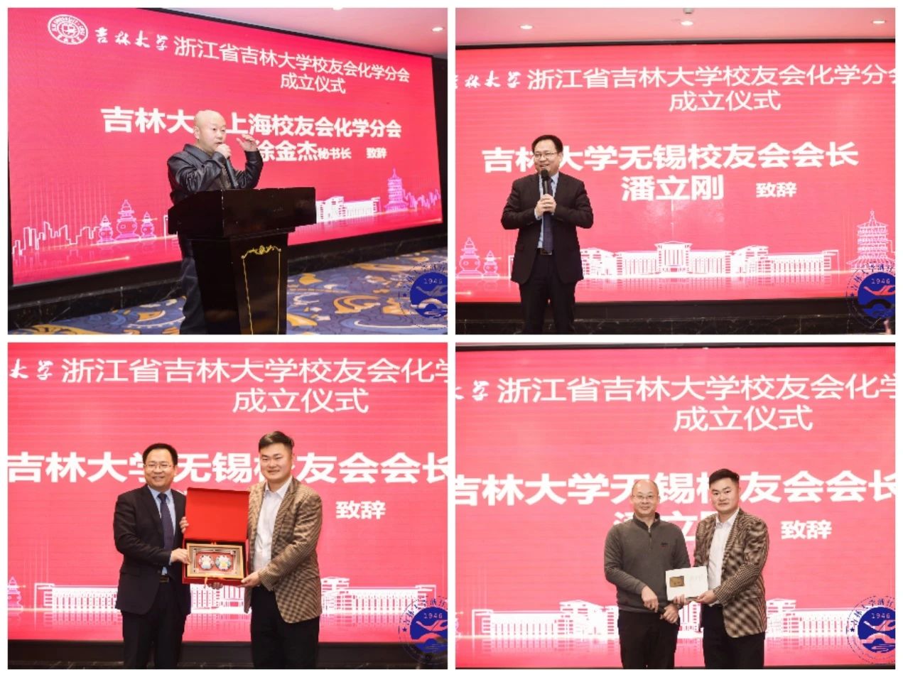 兄弟校友会代表,浙江省北京大学校友会会长陈云峰、辽宁大学浙江校友会会长李欣等在浙知名高校校友会会长,高长有、高明远、牟颖、竺亚斌、苏彬、郑水龙、应子英、商铁存等40余位在浙吉大化学校友齐聚一堂,共同见证成立大会。全球各地吉大化学校友纷纷发来贺信贺电,83级化学校友、杭州师范大学刘俊秋教授,85级化学校友、华南师范大学顾凤龙教授,袋鼠影视