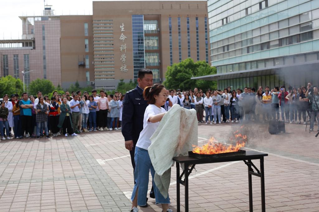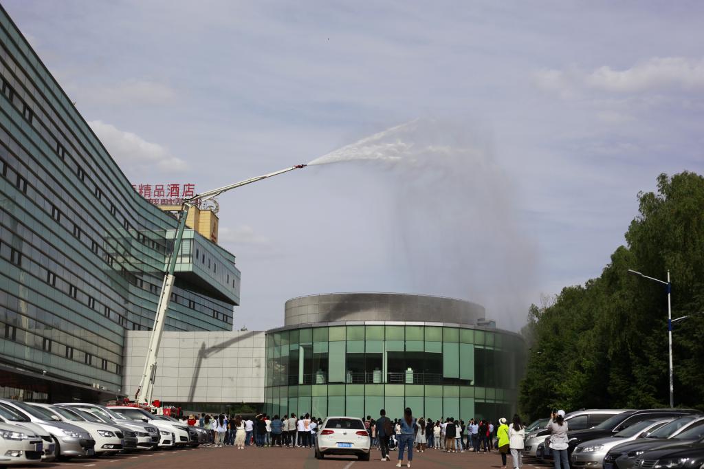 最后,在消防器材实物教学环节,董立明老师详细讲解并演示了干粉灭火器、二氧化碳灭火器、泡沫灭火器、水基灭火器、防火毯等消防器材,10余人次学生在保卫处老师的指导下参与上述消防器材的学习和使用;王俊大队长带领参加本次演练的消防官兵,在水罐消防车上模拟教学消防栓水带的连接和灭火技巧,使用举高喷射消防车演示消防车高空喷水灭火。