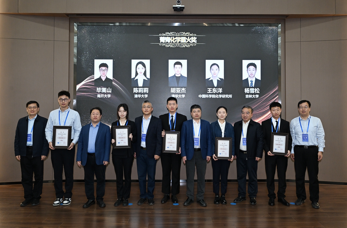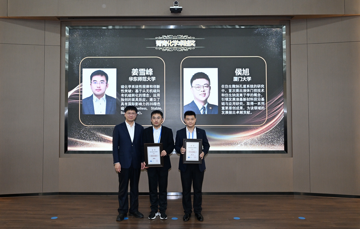 研究生院院长、超分子结构与材料国家重点实验室主任孙俊奇,中国科学院福建物质结构研究所所长曹荣,清华大学化学系原主任王训为“菁青化学星火奖”获奖人颁奖。颁奖仪式由王树涛主持。