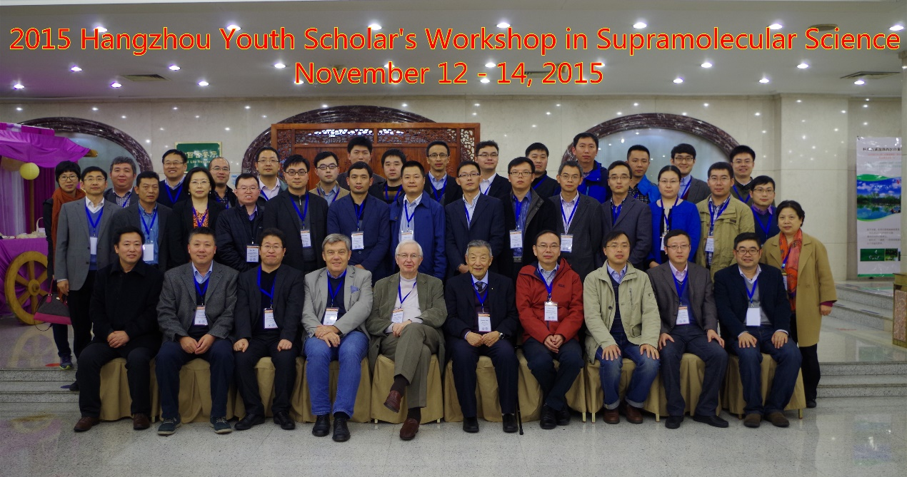 图10 2015年11月,在杭州组织的小型超分子青年学者研讨会。左4至左6分别是德国马普胶体与界面研究所Helmuth Möhwald教授、法国斯特拉斯堡大学Jean-Marie Lehn教授(1987年诺贝尔化学奖获得者)和沈家骢教授