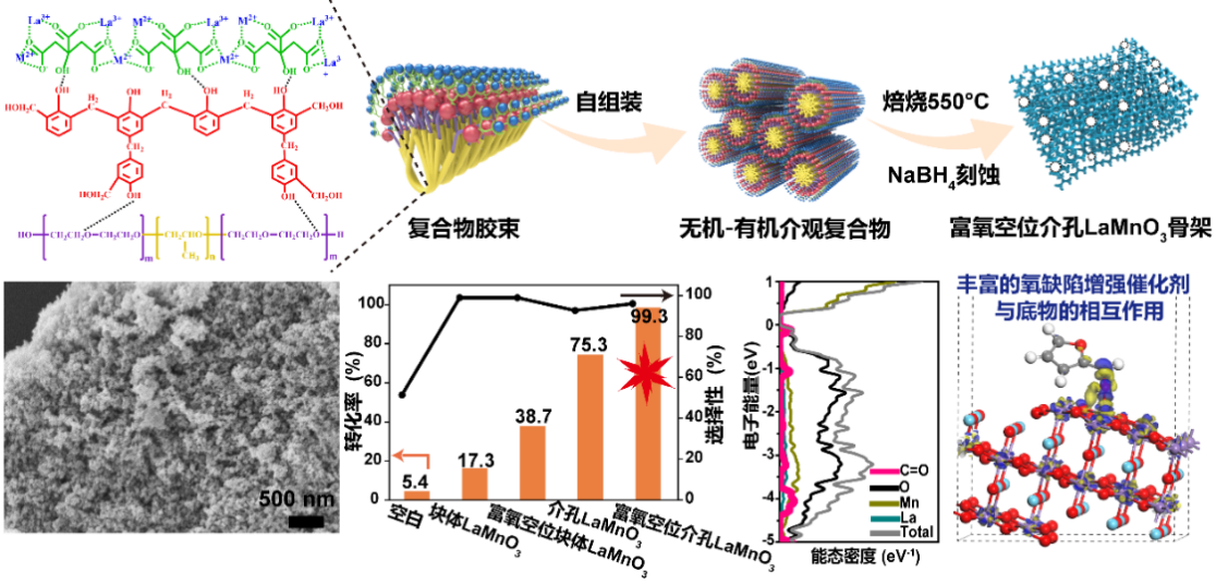近期,课题组以创新性的配位-共聚自组装策略首次合成了介孔ABO3型钙钛矿金属氧化物。采用柠檬酸为配体共配位多金属离子,通过调节其水解聚合速度,酚醛树脂作为稳定剂并驱动与表面活性剂共组装,成功解决了材料合成过程中相分离和高温晶化过程中微观结构坍塌团聚的问题,使产物兼具结晶和多孔结构。该方法可适用于介孔LaMnO3,LaFeO3,LaCoO3,La1-xSrxMnO3等多种钙钛矿金属氧化物的制备。介孔LaMnO3展现出优异的催化加氢活性,糠醛加氢生成糠醇转化率高达99%,且选择性超过96%(Angew. Chem. Int. Ed.2021,60, 4774,如上图所示)。配位-共聚自组装策略亦可实现结构更为复杂的高熵金属氧化物(Co0.2Ni0.2Cu0.2Mg0.2Zn0.2O)的介孔化,以其作为苯甲醇氧化制苯甲醛和苯甲酸的催化剂,常压下两小时即可达到98%的转化率,是同期已报道的最高值(Angew. Chem. Int. Ed.2020,59, 19503)。理论计算揭示了介孔LaMnO3和高熵氧化物的介孔结构不仅加快了反应物和产物的传质,孔表面拥有的大量氧空穴显著提高了催化剂对反应底物的吸附和催化能力。介孔钙钛矿氧化物和高熵氧化物作为高效非贵金属催化剂,其低成本优势在工业催化领域具有广阔的应用前景。