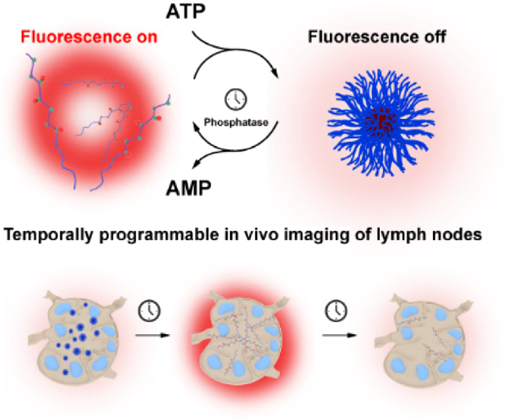 、超分子结构与材料国家重点实验室李云峰教授团队开发了一种ATP驱动、具有良好生物相容性的聚合物纳米粒子的非平衡自组装体系。通过改变带正电荷的聚合物、ATP和磷酸酶的组分浓度,可调控瞬态聚合物纳米粒子的寿命和耗散自组装循环,继而实现了时间可编程的小鼠淋巴结体内成像。该研究为开发具有良好生物相容性和可编程生物功能的非平衡自组装合成系统提供了新方法和新策略。