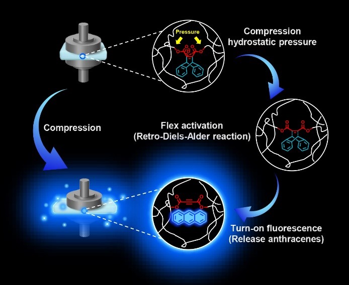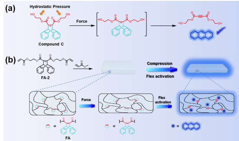 陈于蓝课题组联合肖冠军课题组,设计合成了一类基于蒽-炔Diels-Alder环加成物的力敏基团FA及其弹性体(图1)。通过压缩和高压实验分别研究了它们的力响应特性,发现FA在晶态(图1a)及高分子交联网络(图1b)中均可在机械力作用下发生逆Diels-Alder开环反应,释放蒽分子,产生从无到有的明亮蓝色荧光。通过一系列对比实验,作者阐明了FA的反应经历的是力诱导的“柔性活化”机理,其主要驱动力来自于FA从高张力环转变为平面芳香结构的稳定化过程。与已报道的柔性活化基团相比,FA具有良好的热稳定性,其释放的荧光团浓度以及产生的荧光信号与压力正相关,且易于检测。与传统的基于拉伸断键的可视化力敏基团相比,FA的活化过程保证了高分子主体结构的完整性,使材料实现多次连续活化(图2)。