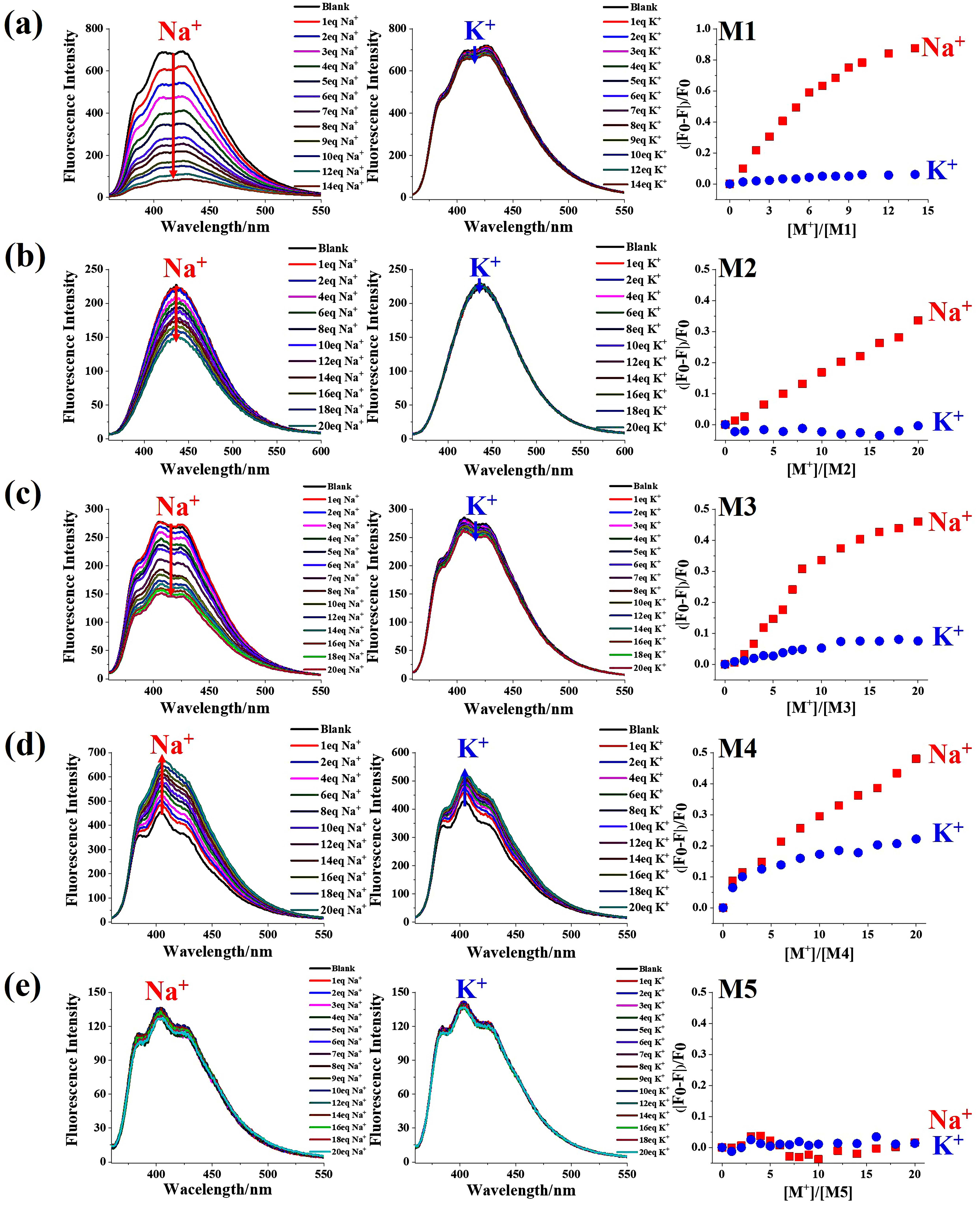 图2.不同纳米孔结构M1-M5对钠离子和钾离子的荧光滴定谱图。