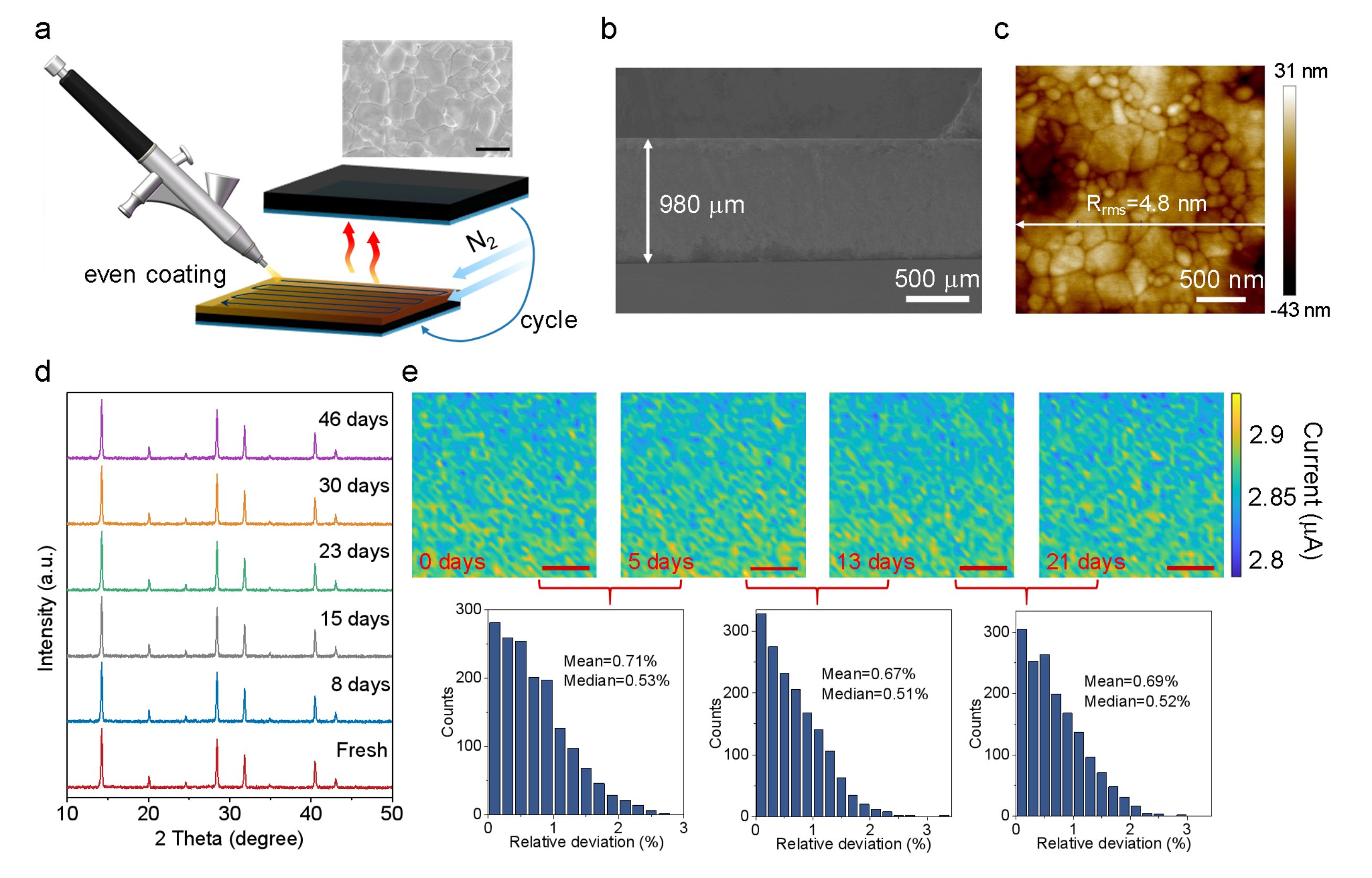 图1.a,钙钛矿层沉积的喷涂工艺示意图及表面扫描电子显微镜(SEM)图像。黑色标尺为2mm。b,钙钛矿膜的截面SEM图像。c,钙钛矿膜的原子力显微镜图像。d,钙钛矿膜在46天内的XRD谱图,表现出优异的结构稳定性。e,光电流成像结果,探测器在532 nm光激发下,不同区域的光电流分布均匀。红色标尺为1 mm。三个直方图展示了其相应的相对偏差。