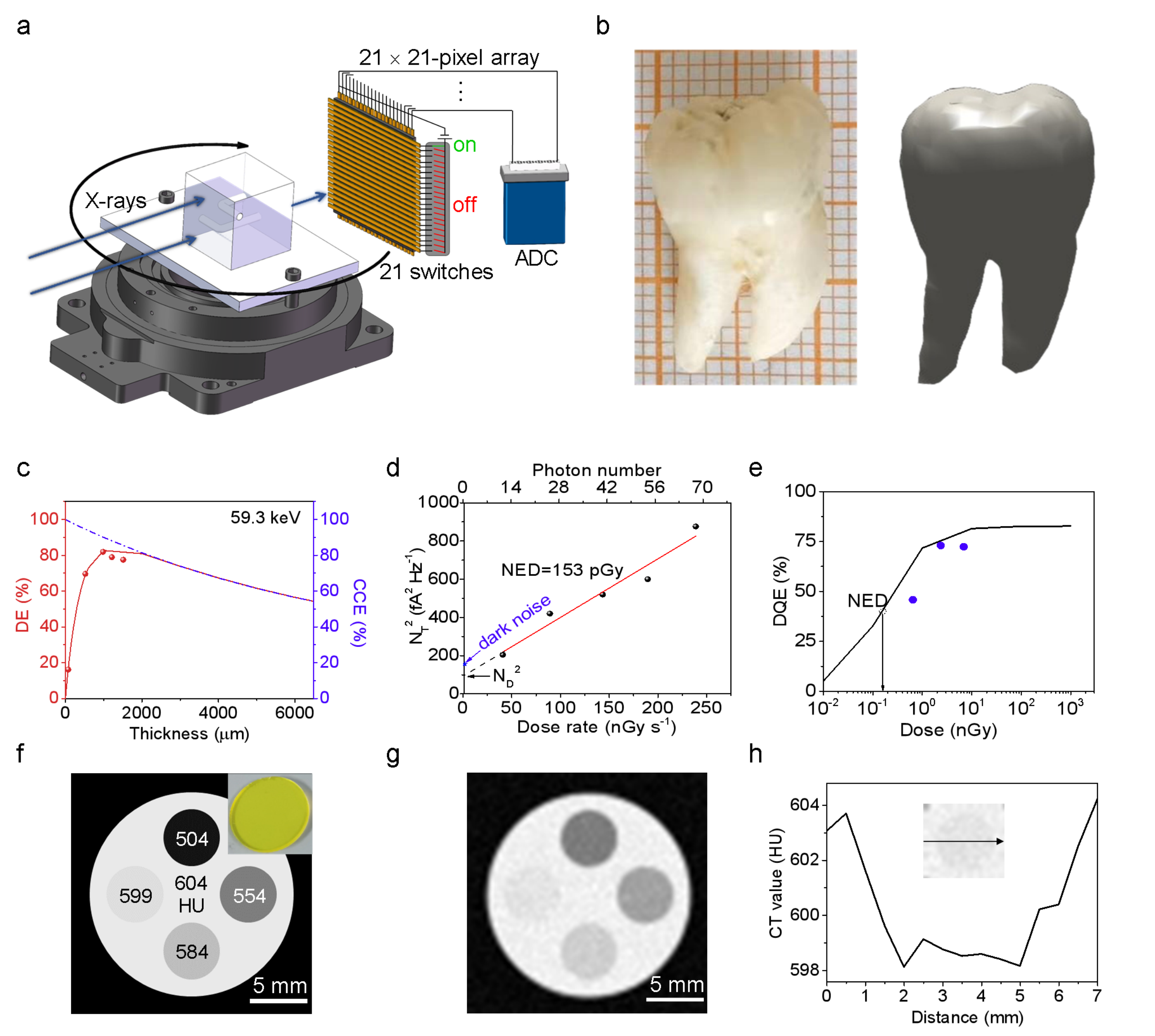 图3.a,钙钛矿CT系统示意图。b,被扫描牙齿的照片和三维重建图像。c,探测效率(DE)和电荷收集效率(CCE)随膜厚度的变化关系。d,噪声电流谱密度随剂量率的变化关系。e,探测量子效率(DQE)随X射线剂量的变化曲线。f,phantom模拟图,显示了phantom的尺寸和四个微孔区域。插图为原始照片。g,phantom切片的重建图像。h,重建图像中599 HU圆形区域的CT值变化。