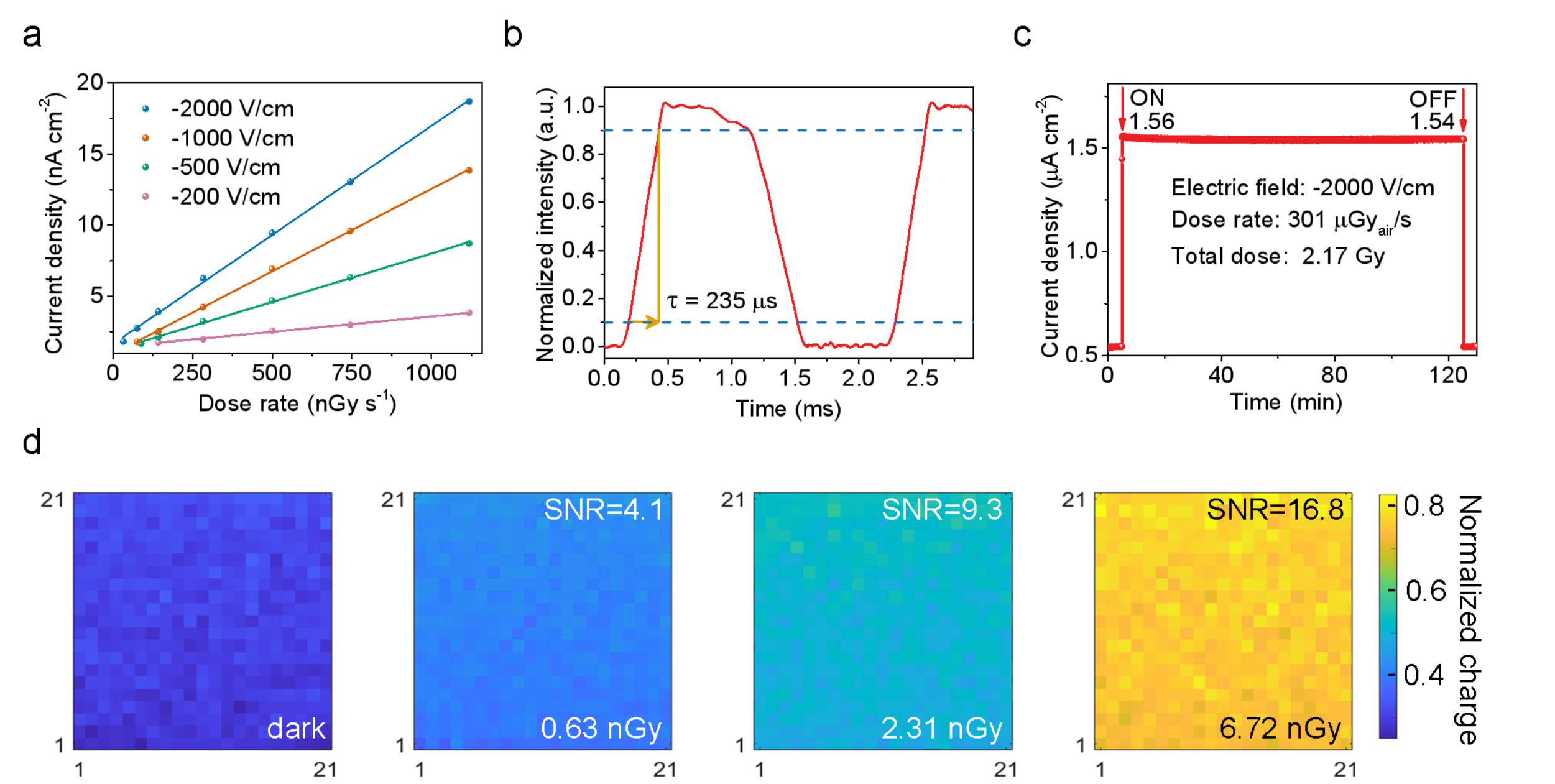 图2.a,钙钛矿探测器在不同电场强度下的光电流密度与剂量率的线性关系。b,探测器在周期性X射线照射下的光电流响应,响应时间为235μs。c,探测器在高电场和高X射线剂量下的电流密度稳定性,测试持续120分钟,信号变化仅1.2%。d, 21 × 21像素阵列在不同剂量下的响应信号均匀性。