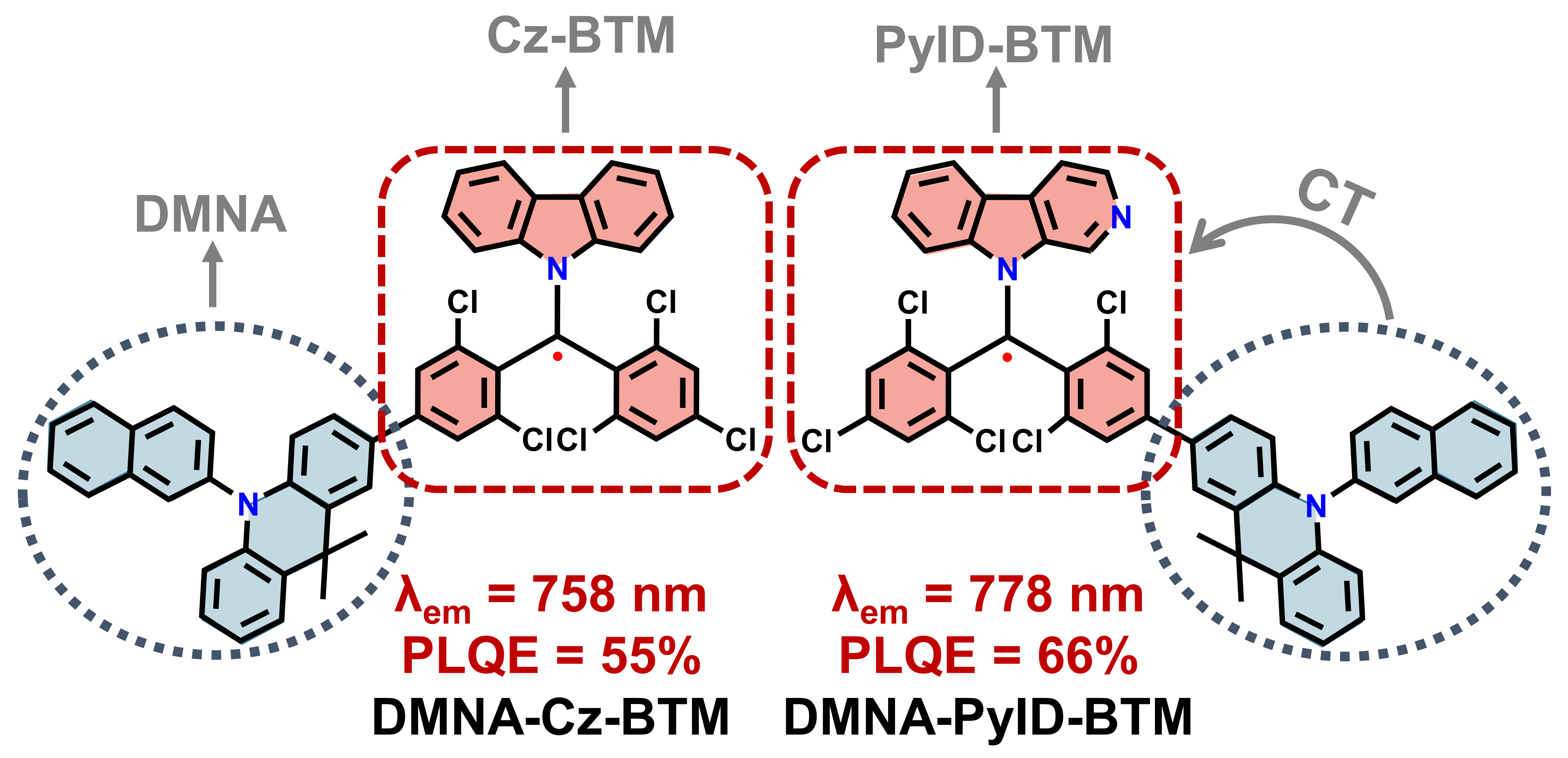 近红外有机发光材料因其在电致发光器件、光学通信以及生物医药领域的广泛应用而备受关注。对于发射峰值波长超过750nm的发光材料,由于“能隙定律”,其光致发光效率(PLQE)远低于可见光发光材料。鉴于有机自由基分子具有低成本、低生物毒性以及易于化学修饰的特点,开发峰值波长超过750 nm的高效近红外有机发光自由基十分有意义。