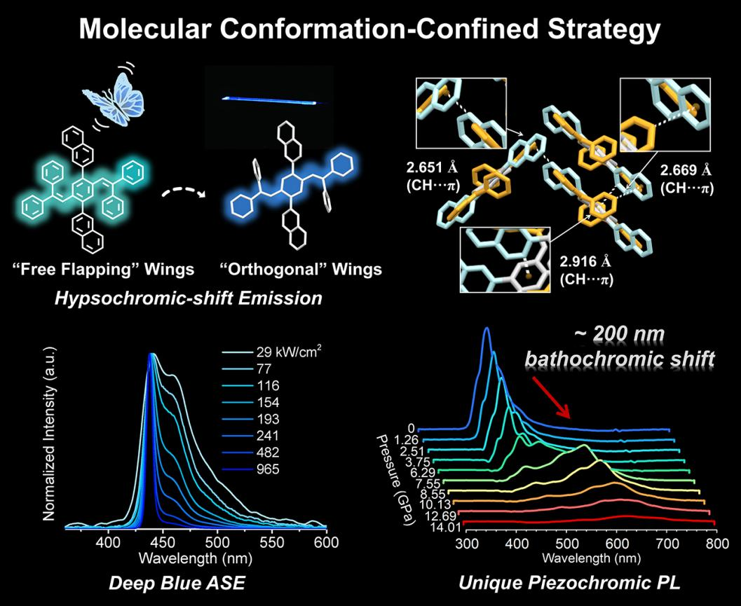 分子的受限构象,窄半峰全宽的深蓝色放大自发辐射及近200 nm压致变色发光红移。