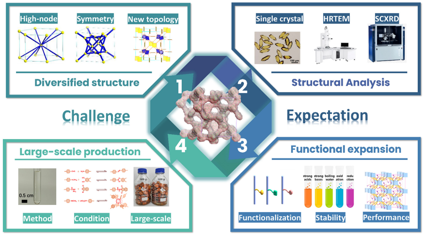 在最近的进展中,高连接3D COFs的出现尤为令人振奋,其复杂的网络结构实现了前所未有的结构复杂性、稳定性和功能性。基于此,方千荣教授课题组在综述中全面概述了高连接3D COFs的合成策略、拓扑设计原则、结构表征技术及新兴应用。并探讨了这些材料在气态吸附和分离、大分子吸附、染料去除、光催化、电催化、锂硫电池和电荷传输等前沿应用领域的潜力。通过研究这些关键领域,加深了对结构与功能之间复杂关系的理解,为未来合成新颖拓扑结构和开发高性能3D COFs提供了参考。(Chem. Soc. Rev.,2025,Doi: 10.1039/d4cs00703d)