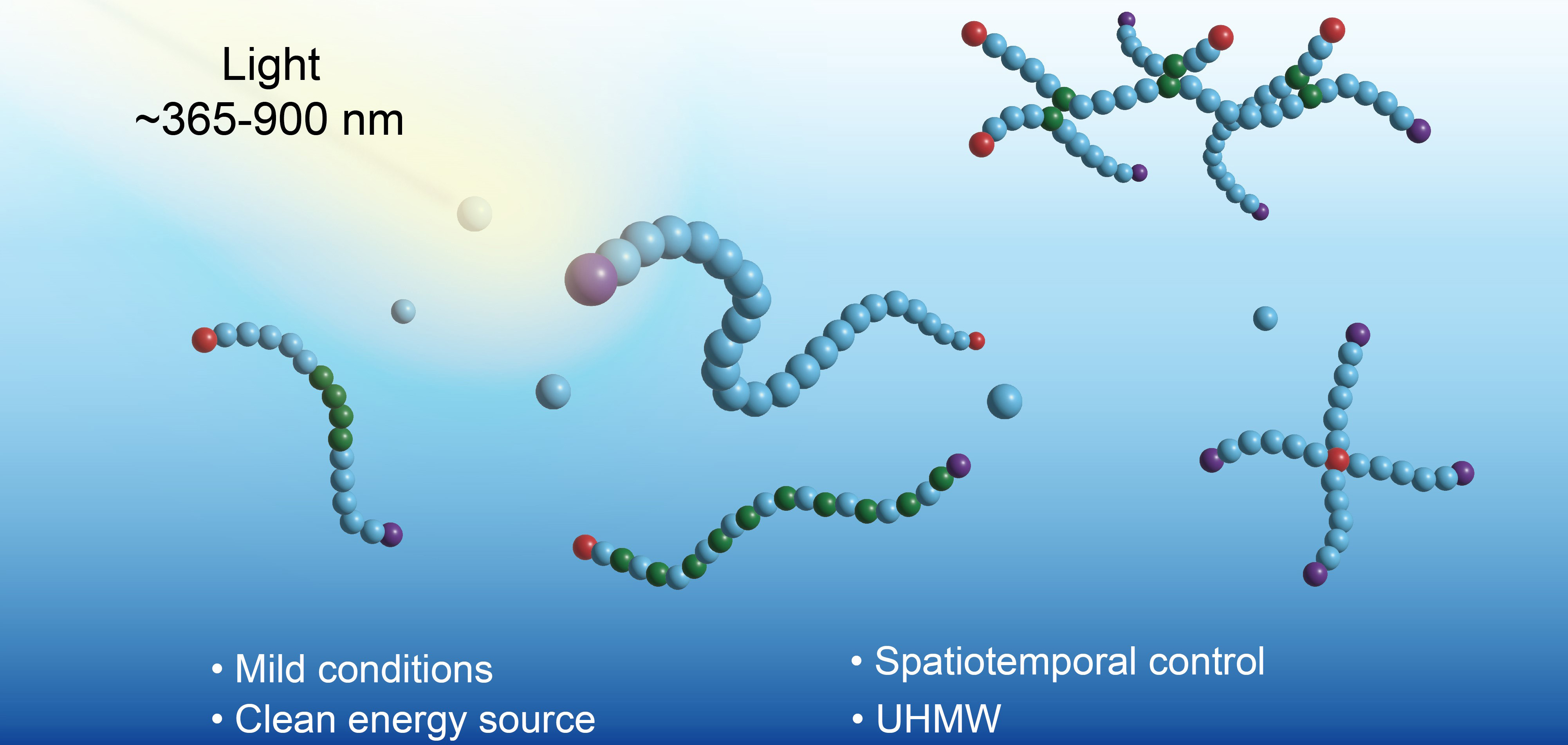 与传统的热引发自由基聚合相比,光控自由基聚合具有反应条件温和、环境友好、聚合速率快、聚合物选择性高、端基保真度高和时空控制等优点。合成具有可控分子量、结构和拓扑形状的超高分子量聚合物要求聚合方法具有高活性和极少的副反应,这一直是自由基聚合领域的一个挑战性问题。近年来多种光控聚合方法的发展,包括光解RAFT聚合、光诱导电子或能量转移RAFT聚合、光酶RAFT聚合、光控原子转移自由基聚合和光控有机碲介导的自由基聚合,为该类性能优良聚合物材料的合成提供了强有力的工具,推动了该类聚合物在流变、界面、材料等领域的应用。最后,文章对未来该领域的发展方向提出了展望,包括光源的选择、高通量聚合、非均相聚合、聚合物结构参数的精确调控以及可持续性问题。