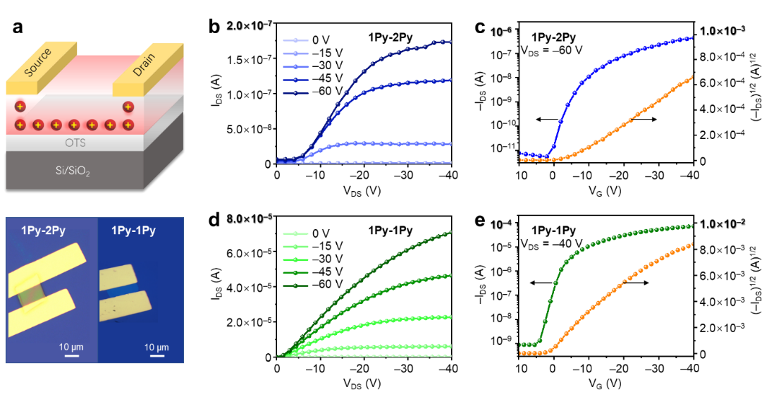 图3基于1Py-2Py和1Py-1Py的OFETs结构示意图、输出曲线和转移曲线