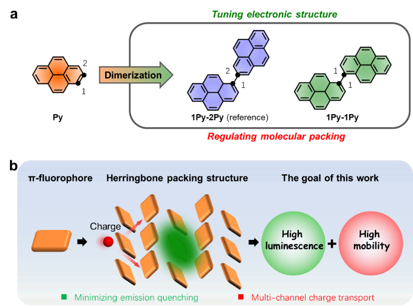 图1.(a)分子结构和(b)同时兼具高发光效率和高迁移率的示意图