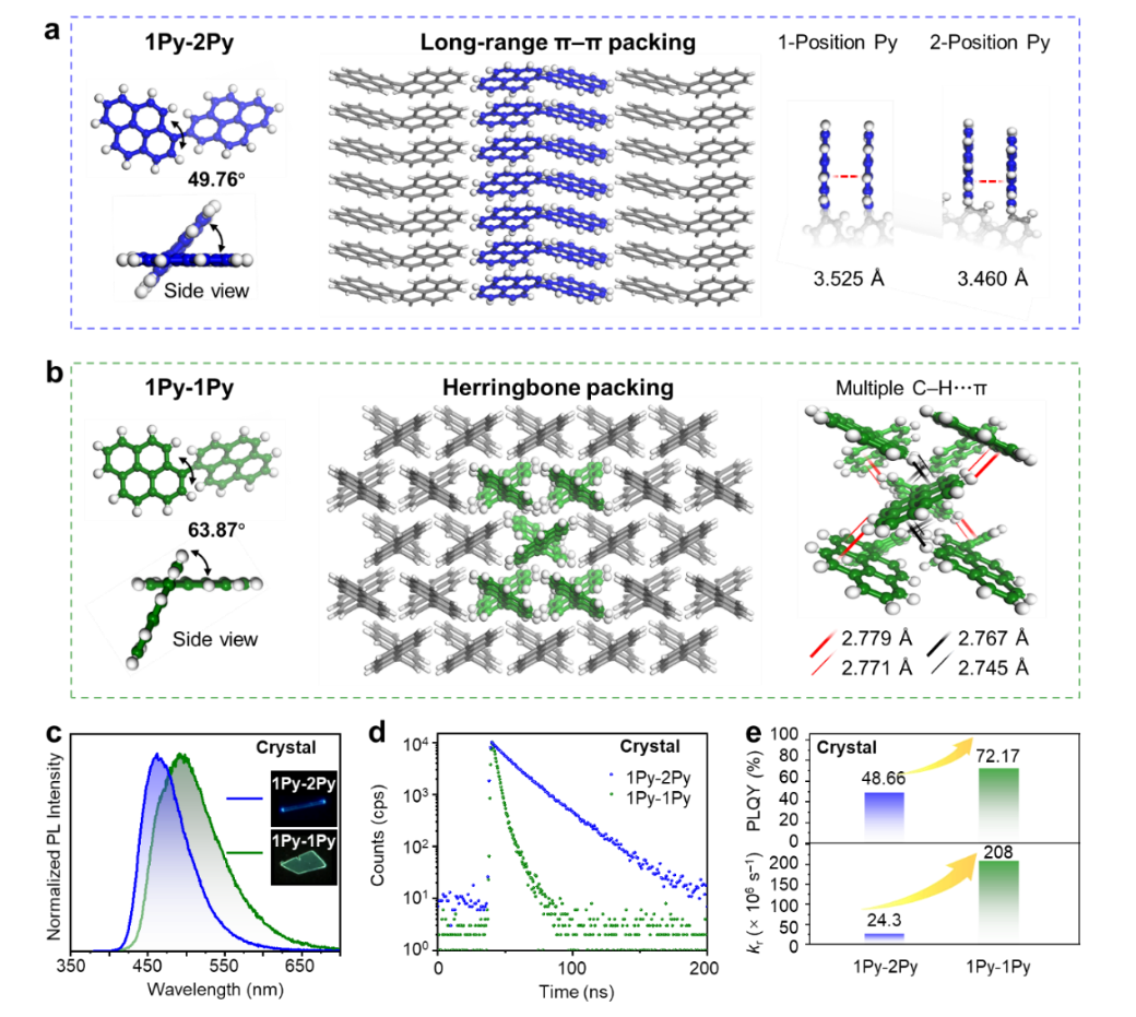研究团队将具有大共轭结构的芘基团进行化学键连二聚化,通过调节芘与芘基团之间的连接位点(图1),调控分子的堆积结构(图2)。1号位芘与2号位芘相连的1Py-2Py分子在晶体中呈一维连续的π–π堆积,而两个1号位芘相连的1Py-1Py分子在晶体中呈二维连续的C–H…π鱼骨架堆积。光物理性质表征和理论计算结果表明,1Py-2Py晶体的连续π–π堆积结构使其表现出芘的激基缔合物发射,发光效率仅为48.66%,而1Py-1Py在晶体中表现为单分子发射,发光效率为72.17%。1Py-1Py晶体的高发光效率主要源于两个原因:一是1号位芘进行二聚化连接后,芘辐射跃迁禁阻的特征被打破,使1Py-Py表现出高效率单分子发光;二是两个芘基团之间具有较大的空间位阻,扭转的分子构型使两个芘基团均呈C–H…π相互作用主导的二维鱼骨架堆积结构,进而削弱了分子聚集诱导发光猝灭效应,使1Py-1Py晶体维持了高效单分子发光性质。