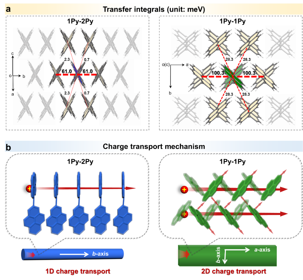 由于1Py-2Py和1Py-1Py之间电荷传输性质的巨大差异,进一步分别估算了两个分子的空穴传输的转移积分和重组能(图4)。对于1Py-2Py晶体,相邻二聚体沿π–π堆叠的1D分子柱的转移积分为61.0 meV,远大于其它任何方向(沿a轴,1.6和0.5 meV;沿c轴,2.3和2.0 meV)。相比之下,1Py-1Py晶体二维鱼骨架形堆积沿ab平面的转移积分高达100.3和28.3 meV(图4a),而沿c轴仅为0.3和4.7 meV。基于转移积分和重组能两个参数,预测1Py-2Py和1Py-1Py的平均迁移率,在趋势上与实验测量结果吻合较好。结果表明,二维多通道分子堆积结构的电荷传输效率高于一维分子柱状堆积结构,这是由于在两种晶体之间缺陷密度相同的情况下,二维多通道分子堆积结构的电荷传输容错能力更强。