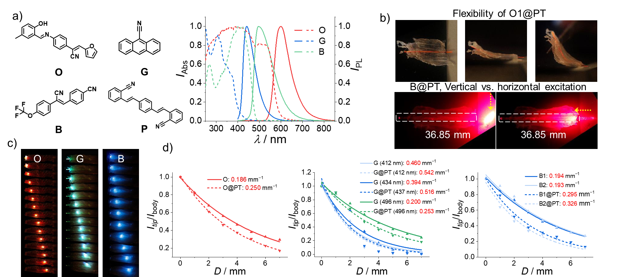 为实现柔性有机晶体在活体内的精准植入,本研究通过磷酸盐缓冲液(PBS)推动,成功将长约2 cm的晶体嵌入小鼠皮下深度达1.1 cm处,并确保有近1 mm的晶体部分悬露于皮外(图3a)。植入后,通过分别采用375 nm与654 nm光源激发,晶体不仅能在体内有效传输信号,还分别展现出主动发光(发射绿光)与被动传输(传递红光)的双重波导功能(图3b-d)。