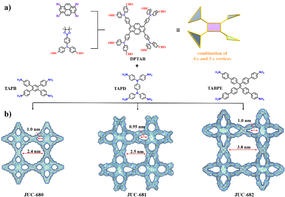 3D COF通常表现出单节点或双节点网络(图1a,b),虽然这些简单的网络指导了3D COF早期的设计与合成,但它们有限的多样性和有限的顶点类型,对结构复杂化与多功能化造成了限制。本研究创新性的提出了一种三节点(trinodal)策略(图1c),提前将四连接的芘和三连接的三苯胺进行组合,得到具有D4对称性的构筑单元DPTAB,在与三种不同的平面四连接氨基单体结合后,成功合成了JUC-680、JUC-681和JUC-682(图2)。利用PXRD、HR-TEM和计算模拟等手段,确认了其晶体结构为未在数据库中发现的jcg拓扑结构。