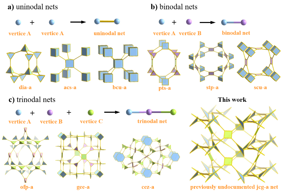 图1.基于不同节点数拓扑网络合成三维共价有机框架(3D COFs)示意图