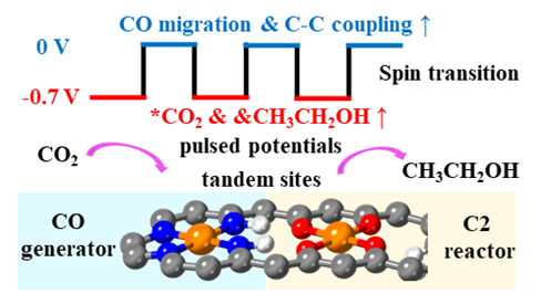 刘靖尧教授团队在电催化CO2还原制备多碳产物的新策略研究方面取得重要进展。受自然界中多酶串联催化机制的启发,研究团队创新设计了双位点单原子纳米酶,并借助巨正则系综下的恒电势密度泛函理论(GCE-DFT)系统揭示了串联位点间的空间分离反应路径,有效提升了乙醇产物的选择性。在此基础上,团队进一步引入脉冲电催化策略,通过对关键反应步骤的时间维度进行精细调控,实现了乙醇生成路径在热力学和动力学上的双重优化。该策略为实现高效CO2电还原制备多碳产物提供了新思路与理论支撑。相关研究成果以题为“A Pulsed Tandem Electrocatalysis Strategy for CO2Reduction”的论文于4月18日发表在Journal of the American Chemical Society上。