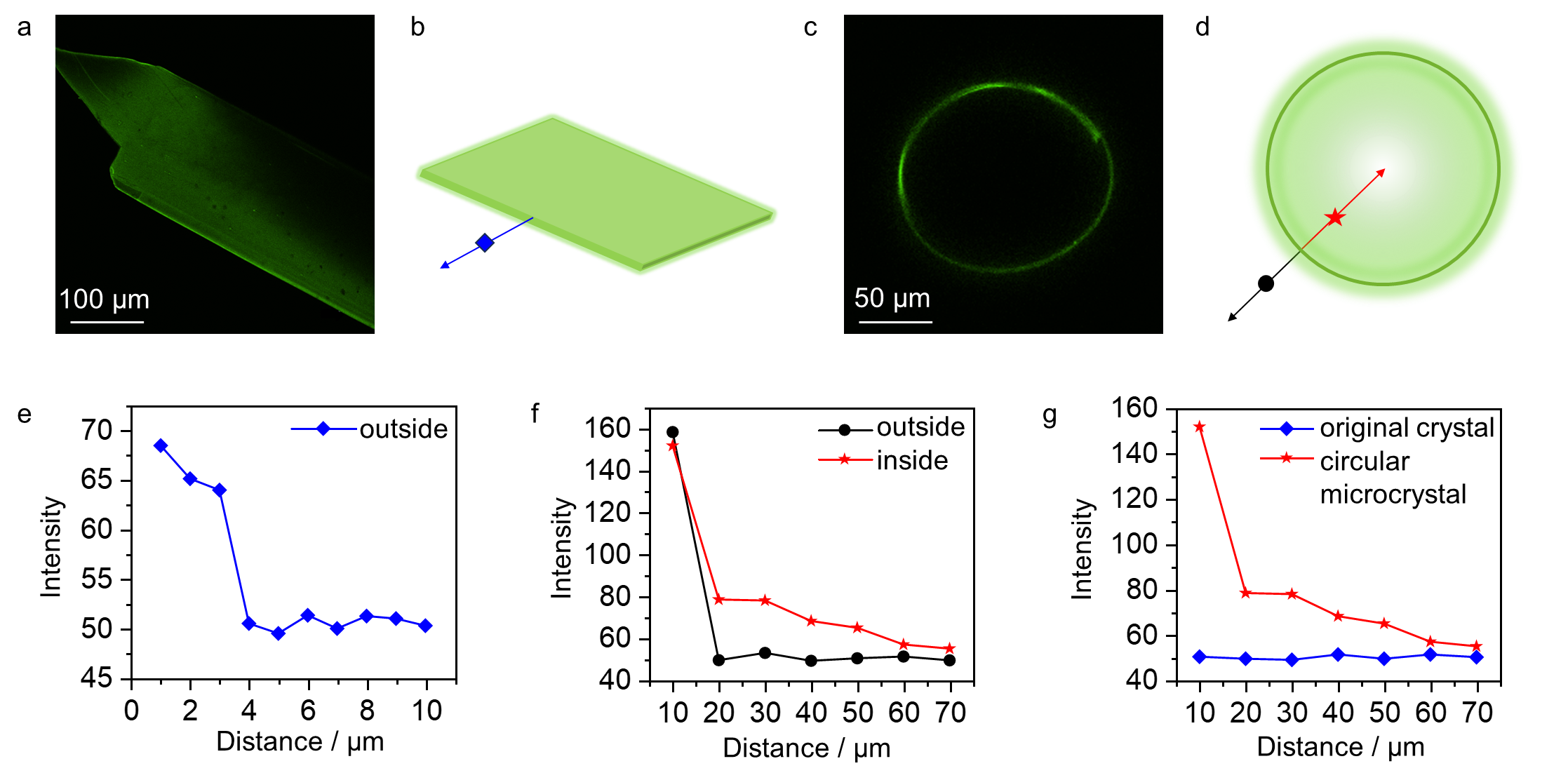 曲率诱导的光限制作用可显著扩展荧光信号范围并增强光-物质相互作用,为远程荧光检测和光子传感应用提供了新可能。激光共聚焦荧光光谱分析表明,光诱导分层形成的空心圆形微晶与原始平面晶体具有显著不同的光学特性。圆形微晶展现出独特的光场再分布能力:其荧光信号不仅在外围增强,更在无材料的中心区域持续存在,且衰减速率远低于原始晶体。