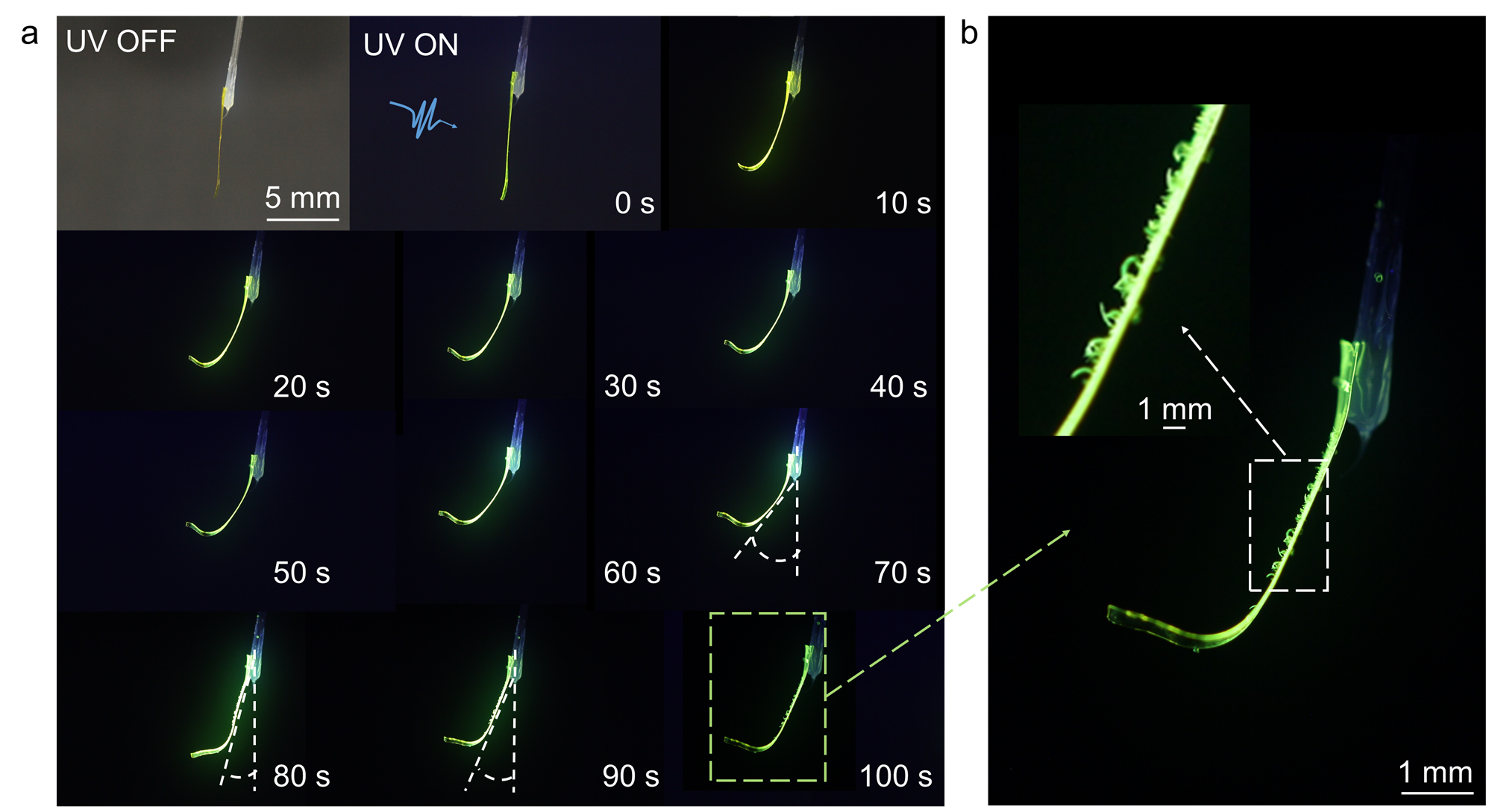 图2.通过紫外线照射晶体所产生的光诱导弯曲和剥离现象