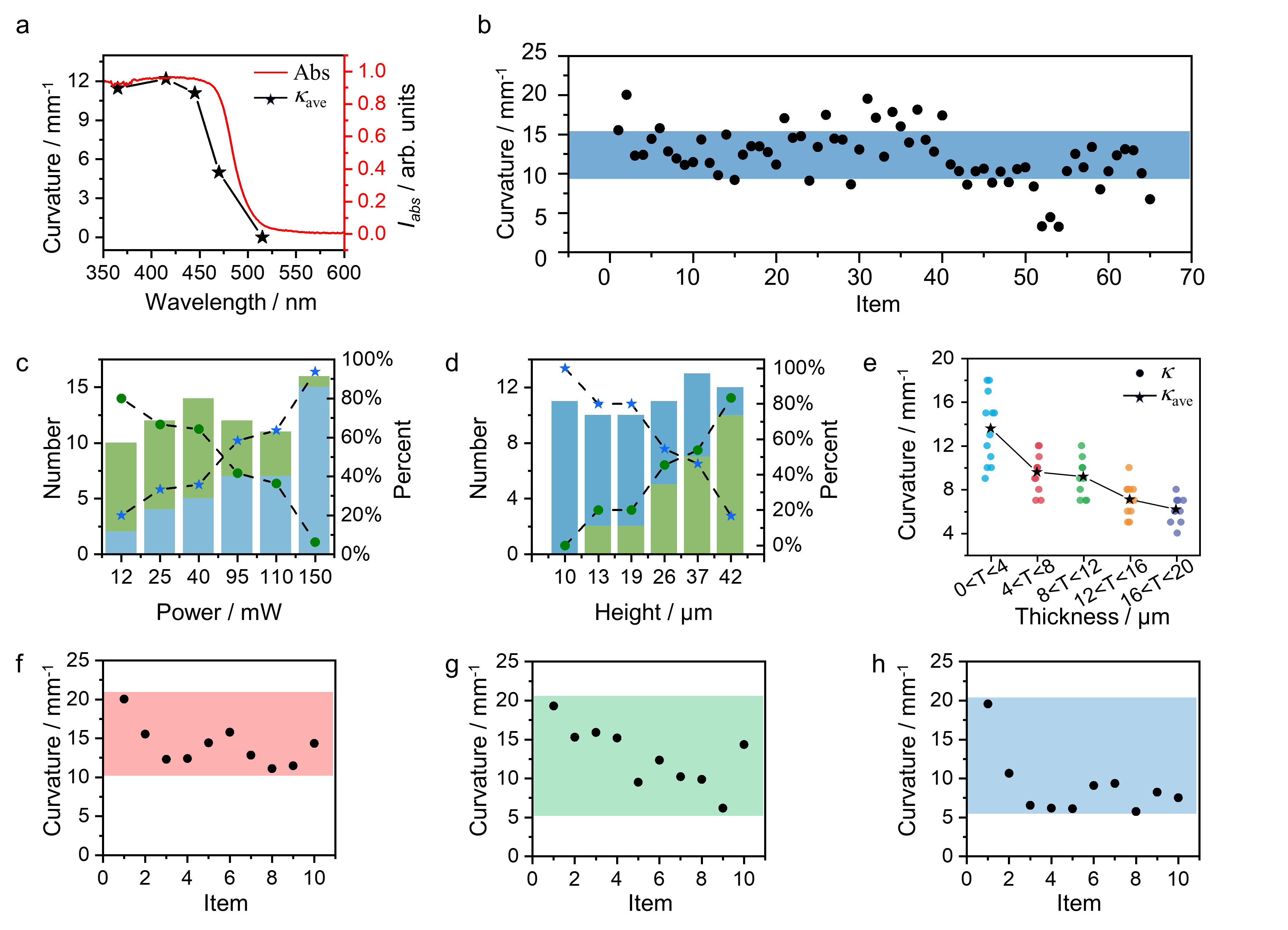 光诱导分层制备的MBID微晶展现出优异的机械弹性和可控的曲率特性,其形态和尺寸受光照波长、功率及晶体厚度显著影响。实验表明,365 nm、405 nm和445 nm波长下微晶曲率较高,而470 nm时降低,515 nm无响应,这与材料吸收光谱相对应(图3a)。405 nm光照射下,微晶曲率集中在10–15 mm⁻¹(图3b),且激发功率越高(图3c)或晶体越薄(图3d),曲率越大。微晶厚度与曲率呈负相关(图3e)。分层后延长光照会因光驱动弯曲效应降低曲率,表明需精确控制光照时间以维持目标曲率(图3f)。这些发现为柔性光电器件中微晶形态的精准调控提供了关键参数。