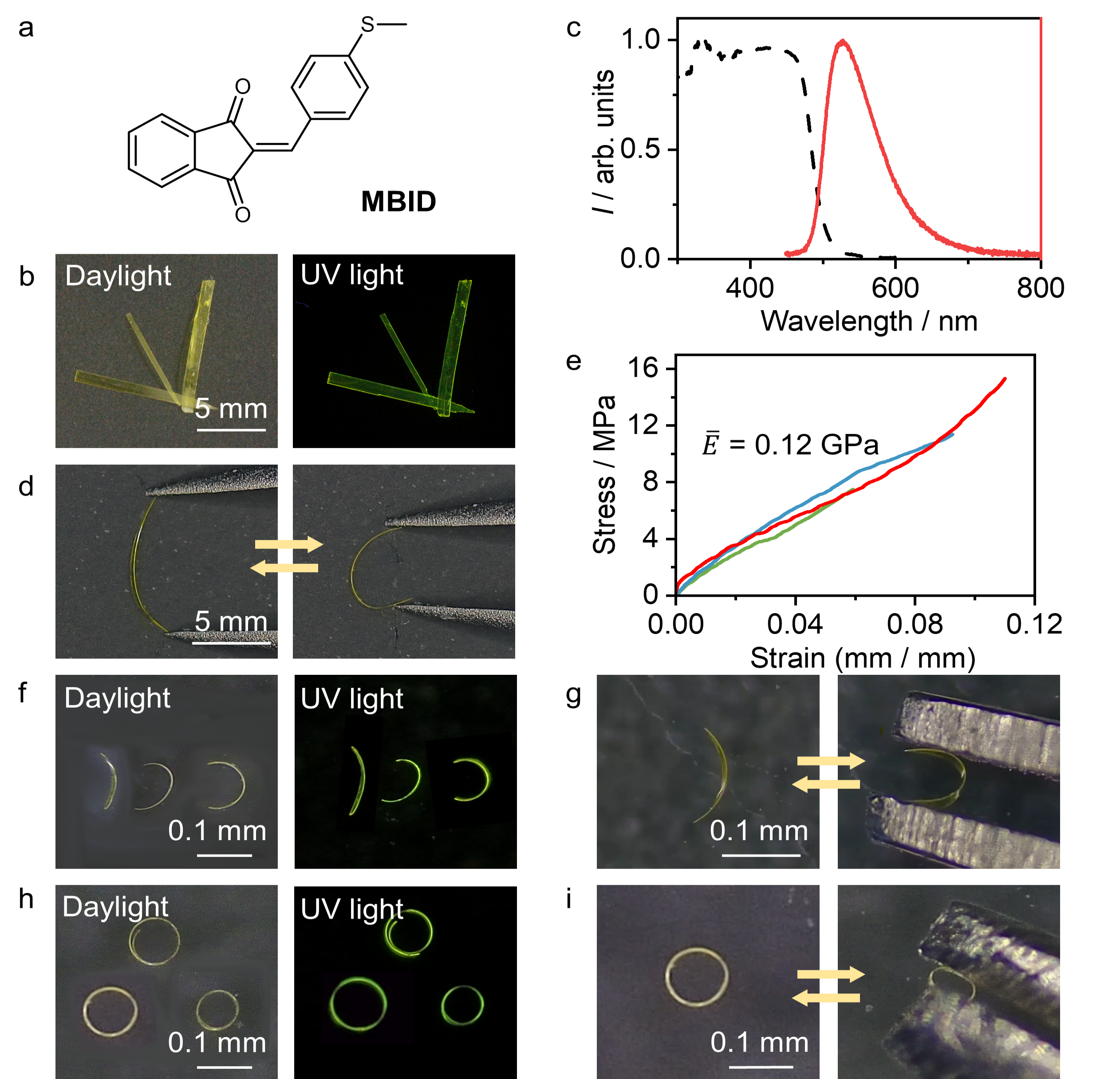 图1. MBID的化学结构(a)及其晶体在日光和紫外光下的照片(b);MBID晶体的紫外-可见吸收和发射光谱(c);MBID晶体的可逆弯曲和展开(d);MBID晶体的应力-应变曲线(e);在日光和紫外光下记录的弧形(f)和环形(h)微晶的摄影图像(f、h); 弧形(g)和环形(i)微晶的可逆弯曲和展开实验(g、i)。