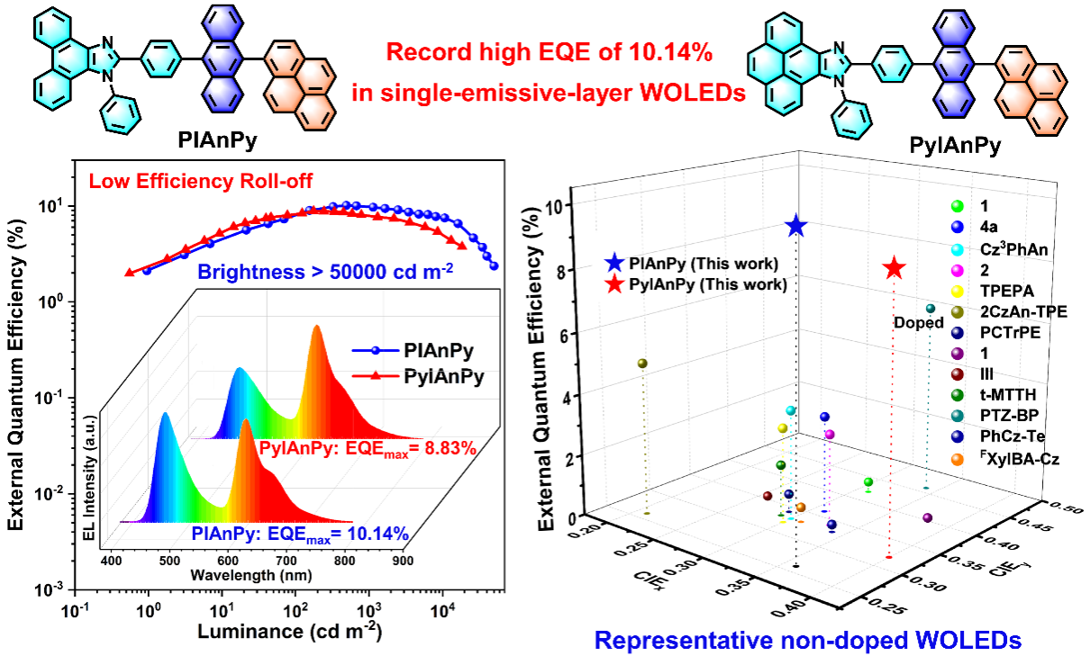 路萍教授团队和华南理工大学乔现锋教授团队合成了一系列基于芳基并咪唑、蒽和芘基团的热激子材料。研究发现,在PIAnPy和PyPIAnPy两个材料中,由于蒽和芘等刚性稠环芳烃(PAHs)的大π共轭平面结构,在固体状态下通过分子间强的相互作用形成了面对面的分子堆积结构,产生了激基缔合物发光,结合芳基并咪唑基团的蓝光短波长发射,二者协同作用使固态下的发射光谱几乎覆盖整个可见光范围,得到了高效率单分子白光材料。