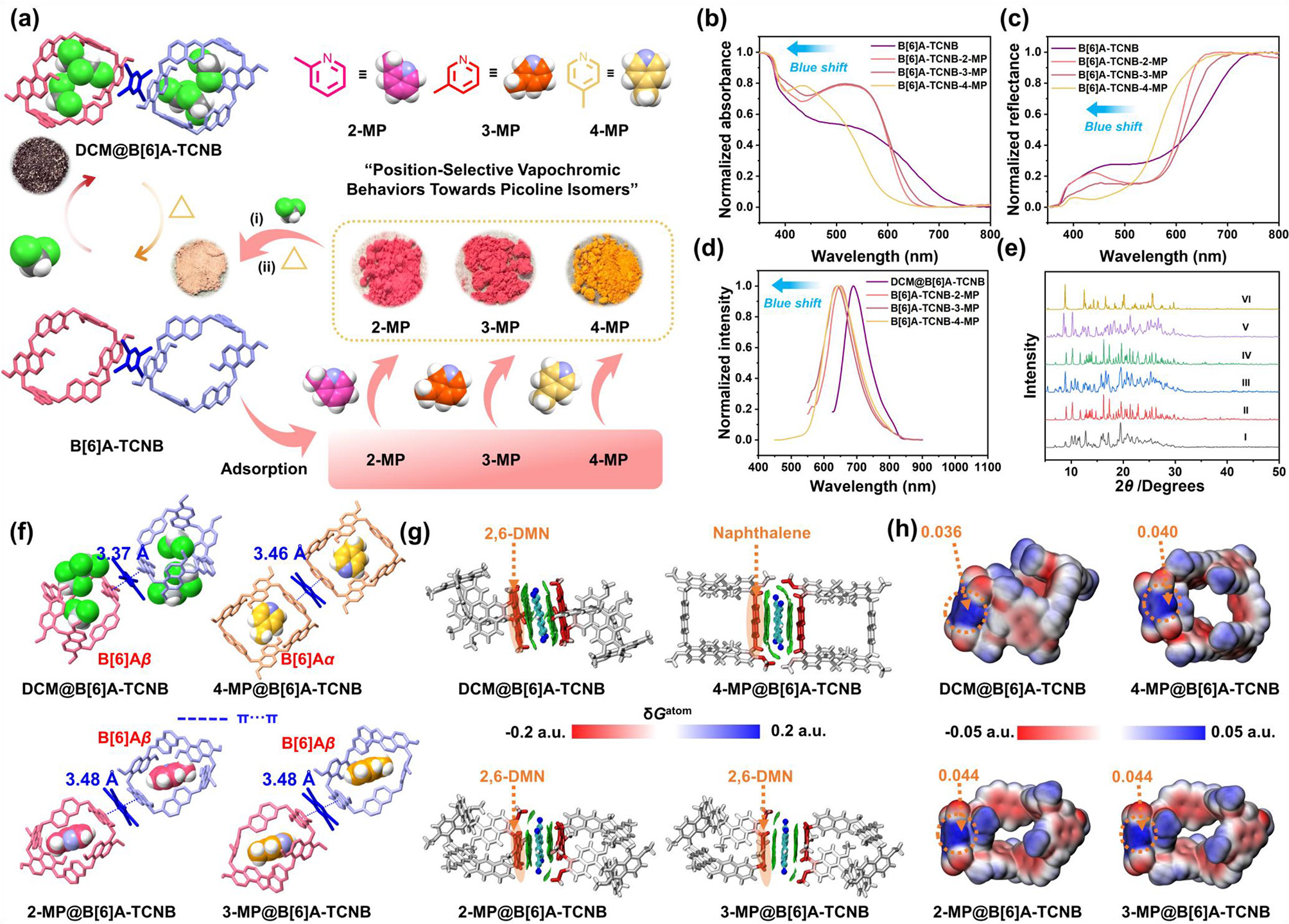 此外,研究发现活化后的晶体材料B[6]A-TCNB可实现对甲基吡啶异构体的选择性汽致变色(图4)。当暴露于2-MP/3-MP蒸汽氛围中时,B[6]A-TCNB晶体颜色由粉紫色转变为亮红色,而在4-MP蒸汽氛围中则变为亮黄色。该现象源于双重作用机制:(1)2-MP/3-MP的引入使B[6]A与TCNB间的π-π堆积距离增大,减弱了两者的CT相互作用;(2)4-MP则诱导B[6]A发生构象转变(由B[6]Aβ转变为B[6]Aα),同时改变了电子转移路径(由2,6-二甲氧基萘转变为未取代萘),极大地削弱了CT相互作用。
