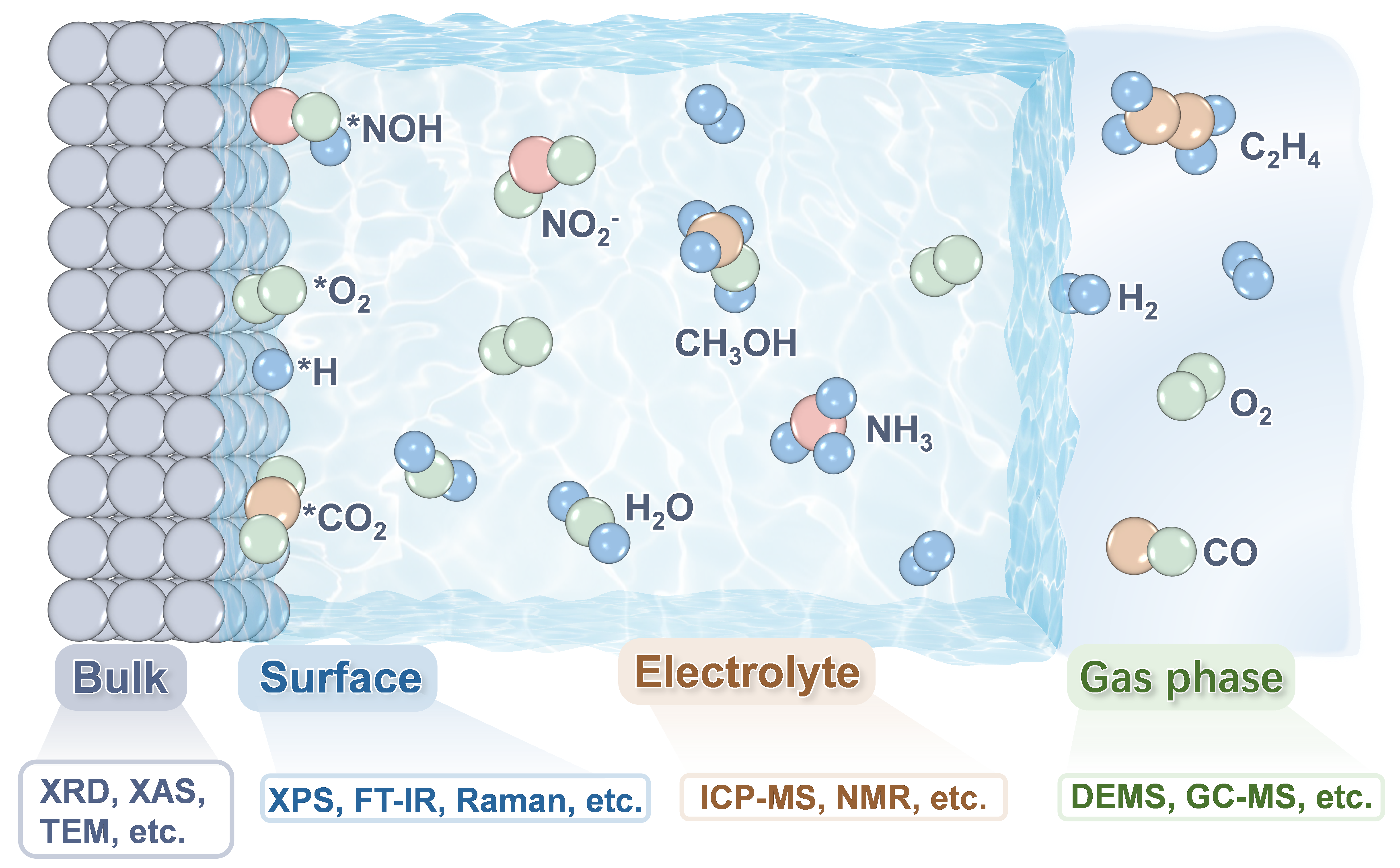认识动态重构过程面临很大挑战。研究者日益聚焦于开发原位/工况表征技术,实现重构动力学的实时监测、真实活性相的识别及瞬态中间体的检测(图4)。例如,原位XRD与XAS技术可追踪晶体结构演变和局域配位环境变化,原位拉曼/红外光谱可识别表面吸附物种与反应中间体。此外,电化学联用技术如在线ICP可定量元素溶解行为,DEMS能追踪气态产物来源。这些技术共同构成气、固、液多维分析体系,为理性设计高性能电催化剂提供了关键依据。