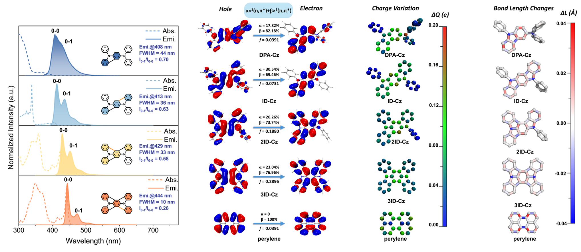 杨兵教授研究团队设计了一种基于吲哚并咔唑(IDCz)的分子模型体系,通过逐步化学锁定苯环,精确控制分子的π共轭平面大小。四种模型化合物(DPA-Cz, ID-Cz, 2ID-Cz和3ID-Cz)分别代表逐渐增加的苯环锁定趋势。这一巧妙模型设计便于实验观察分子结构变化对应的发射光谱形状改变。我们发现随着π共轭平面增大,0-1和0-2振动峰均显著抑制,导致发射光谱逐渐变窄趋势。
