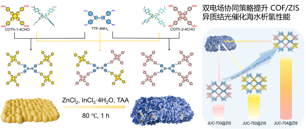 为解决上述挑战,方千荣团队发展了“分子内电场 + Z-scheme 界面电场”双电场协同策略。研究者基于环辛四噻吩(COTh)异构体的硫原子空间排布差异,通过分子设计构筑出具有可控电荷不对称性的 COF 框架,使其内部产生定向 intramolecular electric field。随后通过原位生长 ZnIn₂S₄(ZIS)构筑 COF/ZIS 紧密界面,形成具有强界面驱动力的 Z-scheme heterojunction,使两个电场方向一致、协同作用,大幅提升电子–空穴的分离效率。所构筑的 JUC-704@ZIS(1:8)在海水中实现 9.46 mmol g⁻¹h⁻¹的无助催化剂析氢效率,并在加载Pt 后提升至 25.08 mmol g⁻¹h⁻¹,在循环测试中仍保持优异结构稳定性。多种谱学与电化学手段进一步验证了双电场对电荷迁移路径的调控机制。