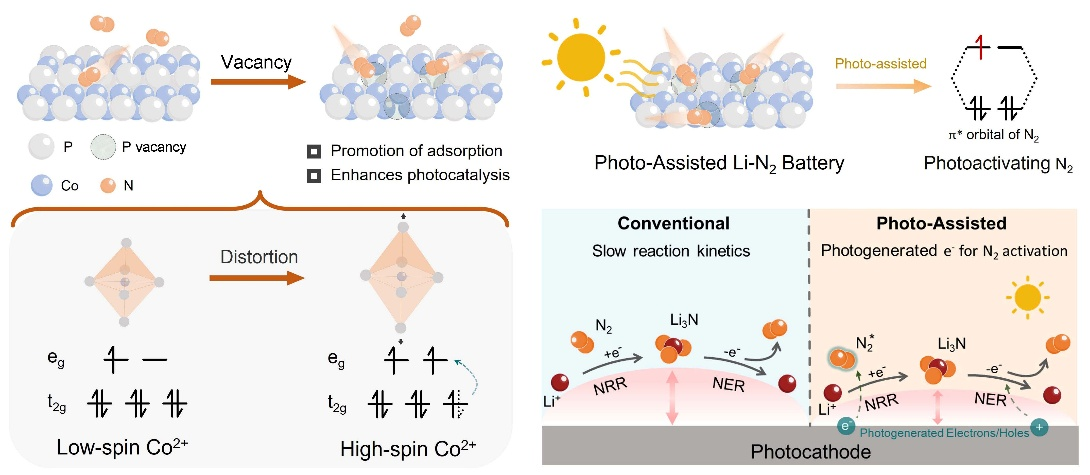 为解决上述问题,徐吉静教授团队提出了一种“光活化固氮”新策略,并对光辅助锂-氮电池的作用机制提供了关键见解。研究团队通过精准引入磷空位,设计并制备了一种具有高自旋态的缺陷型磷化钴(CoPv)光电催化正极。磷空位的引入,一方面促使钴离子从低自旋态转变为高自旋态,另一方面为氮气分子提供了稳定的吸附位点。高自旋态钴位点的自旋极化电子能高效转移至吸附的氮气分子,从而显著提升氮气活化效率。在光照条件下,光生电子可经由磷空位直接注入氮气的π*反键轨道,进一步增强氮气活化,并加速放电过程中的氮还原反应动力学。此外,光照还有助于诱导形成均匀的薄膜状放电产物,从而提升充电过程中的氮析出反应动力学。实验结果显示,基于该策略的光辅助锂-氮电池展现出优异的电化学性能:放电比容量高达2.71 mAh cm-2,循环寿命超过900h,过电位低至1.3 V。在光照条件下,电池的法拉第效率从黑暗环境中的33.5%提升至59.8%,固氮能力得到大幅增强。