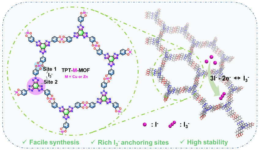 2026年3月2日,团队在Angew. Chem. Int. Ed.发表题为“N-Rich Tris(triazole)-Based 2D Conjugated Metal-Organic Framework for High Performance Aqueous Dual-Ion Batteries”的研究论文。该工作设计合成了两种新型三(N-苯基)三唑基二维共轭金属有机框架(TPT-M-MOF, M = Cu, Zn),并将其作为碘物种的载体材料用于水系锌-碘双离子电池。研究发现,富氮骨架与[MO₄]金属中心对I3⁻物种的协同锚定作用是提升电池性能的关键。其中,TPT-Zn-MOF在1 A g-1电流密度下实现435 mAh g-1的高比容量,并在5 A g-1下循环1000圈后仍保持良好稳定性。光谱表征与理论计算表明,优异的电池性能源于富氮骨架的丰富作用位点与配位金属中心的协同效应。该工作为开发高性能水系双离子电池碘载体材料提供了新思路。袋鼠影视