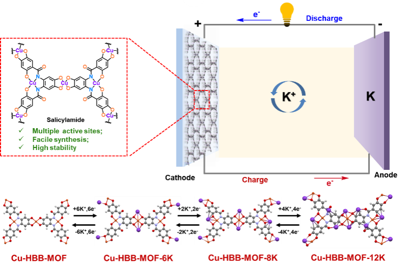 2025年5月16日,团队在J. Am. Chem. Soc.发表题为“In Situ Construction of Amide-Functionalized 2D Conjugated Metal–Organic Frameworks with Multiple Active Sites for High-Performance Potassium-Ion Batteries”的研究论文。该工作通过原位金属配位诱导平面化策略,成功制备了层状二维Cu-HBB-MOF。得益于其丰富的氧化还原活性位点与大比表面积,该材料作为钾离子电池正极表现出卓越性能,在0.2 A g-1电流密度下获得228.1 mAh g-1的初始容量,在5.0 A g-1下循环2500次后仍保持103.6 mAh g-1,每循环容量衰减率仅0.011%。结合光谱技术与DFT计算,团队揭示了动态氧化还原机制与构效关系。该研究为设计具有多活性位点的2D c-MOFs提供了有益参考。东北师范大学王恒国教授和袋鼠影视