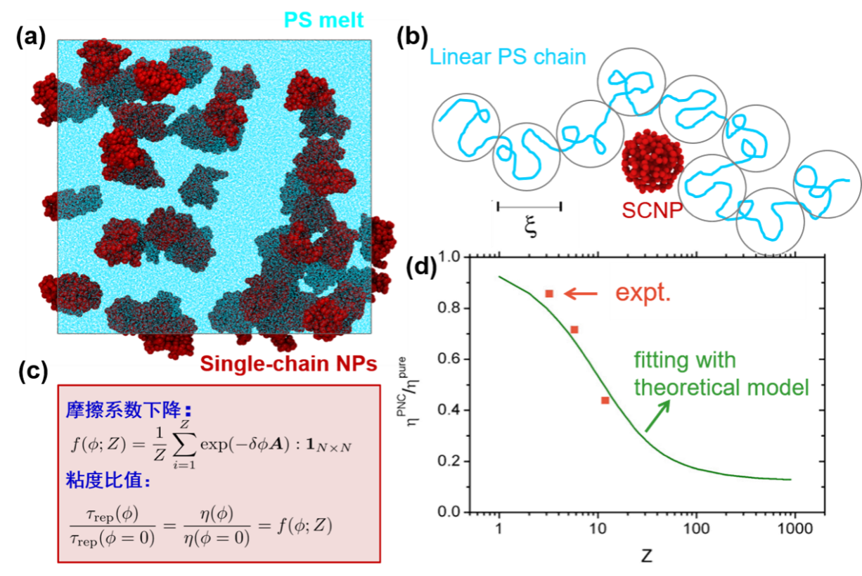 图:(a)体系示意图:图中红色部分为高分子单链纳米粒子,青色部分为高分子熔体;(b)单链纳米粒子(SCNP)与高分子链作用范围示意图;(c)理论模型;(d)流变实验所测得的复合物粘度与线性高分子链纯熔体零切粘度的比值(hPNC/hpure)以及理论模型拟合