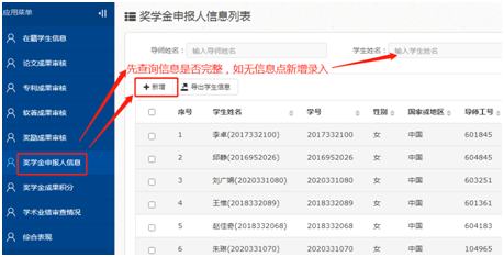 研究生师生信息综合库”(//one.dsdytv.net/),在【奖学金成果积分】栏进行查询(见下图说明)。初评获奖候选人再次核实自己是否填报【奖学金申报人信息】,涉及发放奖学金银行卡信息等。