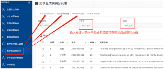 研究生师生信息综合库”(//one.dsdytv.net/),在【奖学金成果积分】栏进行查询(见下图说明)。