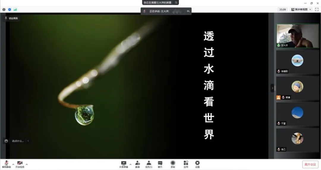 汪大洋教授从一个水滴引发的思考出发,由浅入深的为同学们讲述了一系列生动有趣的探究历程:科学家们认识水、发现水物理性质的过程;随着光谱技术成熟了解到氢键、进而确定水分子结构、观察氢键赋予水的特殊性质以及从而得到一些与水有关现象为我们传递的信息等。