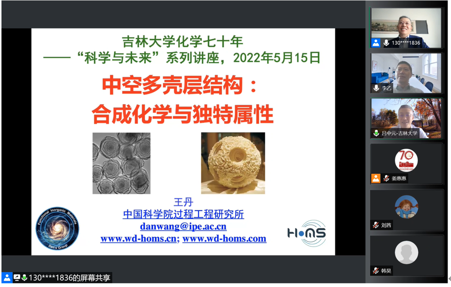 5月15日上午,中国科学院过程工程研究所研究员,国家杰出青年科学基金获得者王丹应邀线上做客“吉大化学七十年——科学与未来系列讲座”,以“中空多壳层结构:合成化学与独特属性”为题,为学院师生作学术报告。