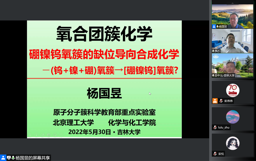 5月29日上午,北京理工大学教授,国家杰出青年科学基金获得者杨国昱应邀线上做客“吉大化学七十年——科学与未来系列讲座”,以“氧合团簇化学”为题,为学院师生作学术报告。