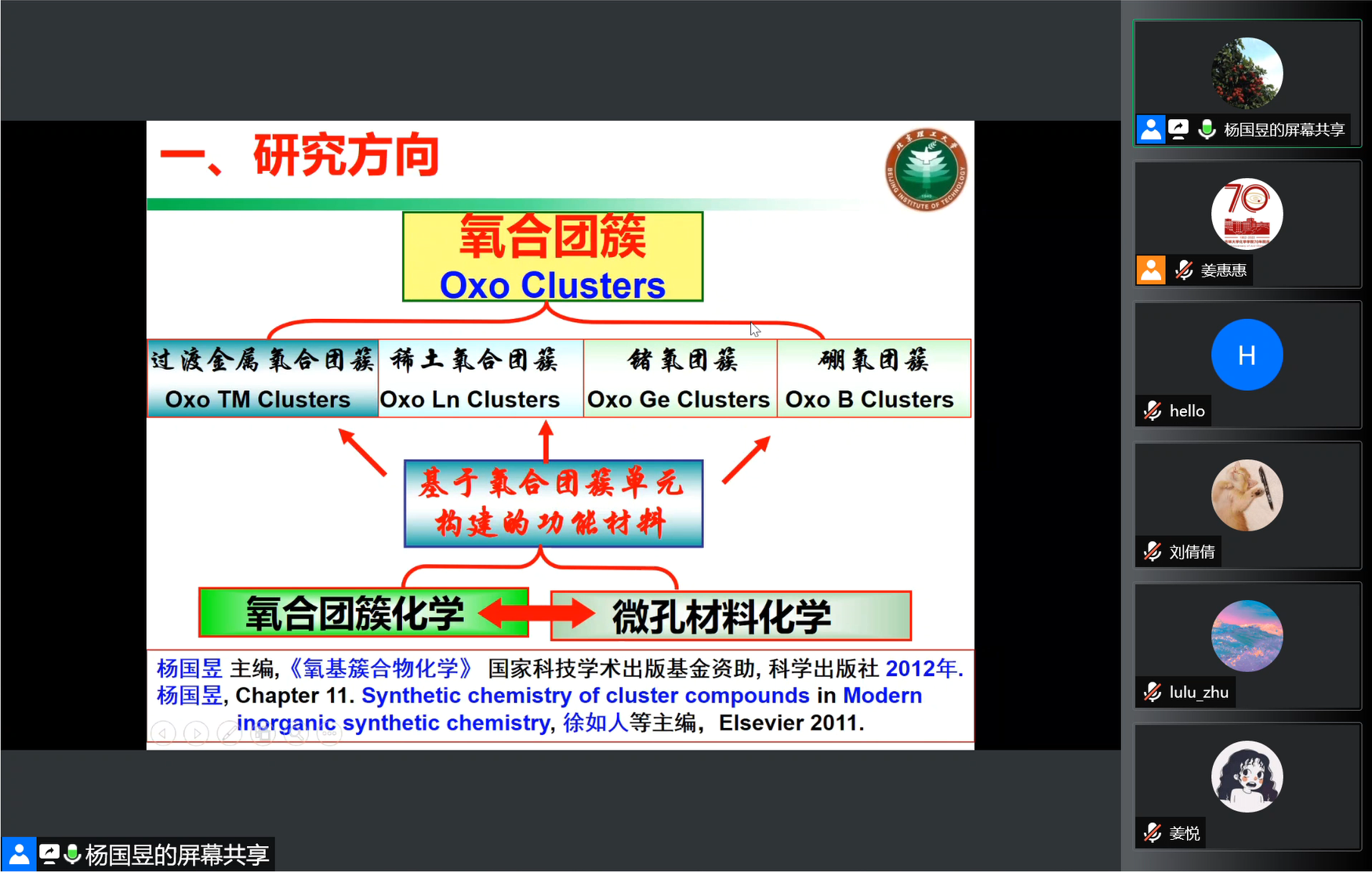 讲座中,杨国昱教授围绕氧合团簇化学,全面地介绍了其课题组在过渡金属氧簇、稀土氧簇、锗氧团簇及硼氧团簇等氧合团簇合成领域的研究进展。在交流互动环节,杨国昱教授耐心详细地解答了院内外师生的问题,并对相关领域的发展做出了展望。袋鼠影视