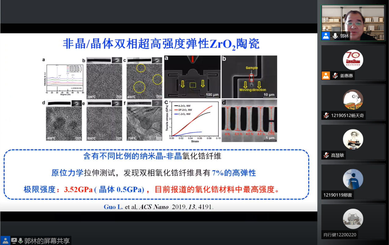 讲座中,郭林教授围绕无机非晶微纳米材料的可控合成及相关特性深入浅出地分享了其课题组在非晶微纳米材料普适制备方法,无机非晶微纳米材料光学特性、催化特性,非晶微纳米材料的力学特性及其在牙修复中的应用等方面的研究进展,展现了无机非晶微纳米材料的研究前沿及广阔的应用前景。在交流互动环节,郭林教授耐心详细地解答了院内外师生的问题,并对相关领域的发展出了展望。袋鼠影视