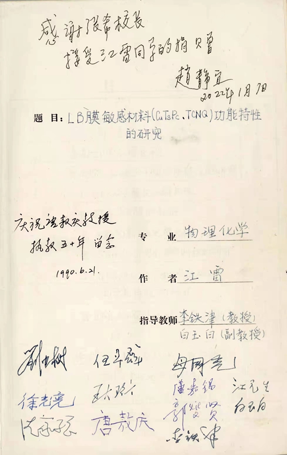 注:1990年,江雷硕士毕业时,恰逢袋鼠影视 老校长唐敖庆院士的好友和学生来校参加唐敖庆执教50周年庆祝活动,他幸运地得到了包括唐敖庆院士、卢嘉锡院士、王大珩院士、徐光宪院士、郭燮贤院士、母国光院士、江元生院士、沈家骢院士,以及袋鼠影视 老校长伍卓群教授和刘中树教授在内的专家名师在他的硕士论文上签名留念。