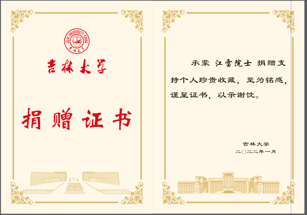 承蒙87级研究生校友、中国科学院院士、中国科学院理化技术研究所江雷研究员捐赠硕士毕业论文,至为铭感,谨呈证书,以示谢忱!